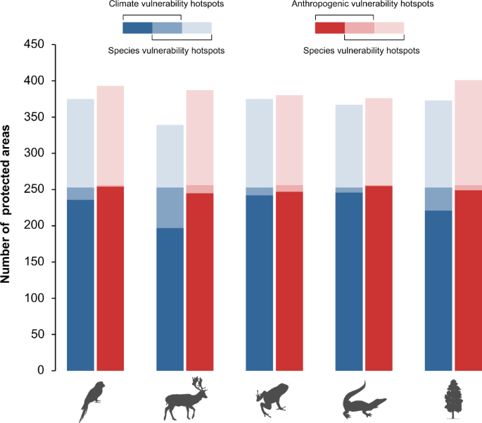 评估确定17%的保护区是气候和人为脆弱性的热点,23%的保护区是物种脆弱性的热点。同时,物种脆弱性热点具有气候高度不稳定性,气候变化与人类活动加剧情况下,这可能意味着未来物种将面临更大的挑战。