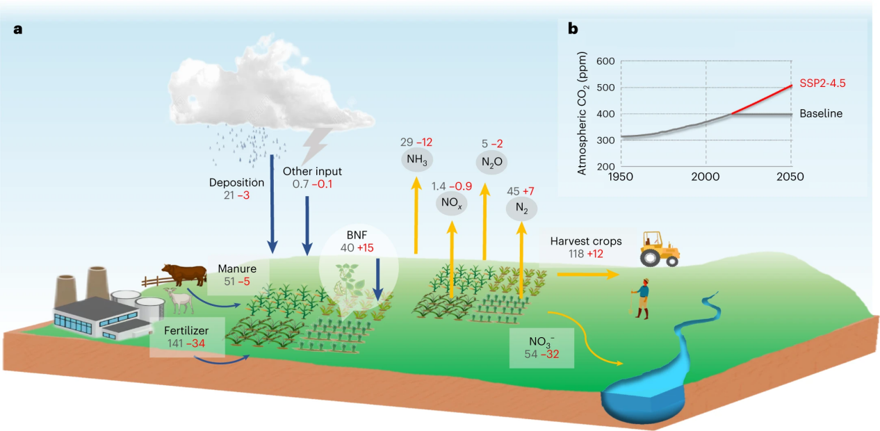 a,氮输入和输出构成主要氮流量,分别用蓝色和黄色箭头表示。深灰色的氮流量值表示没有气候变化的基线情景中的流量;红色流量表示 eCO2流量的变化。相对于基线方案,这些数字是根据预测得出的未来值。