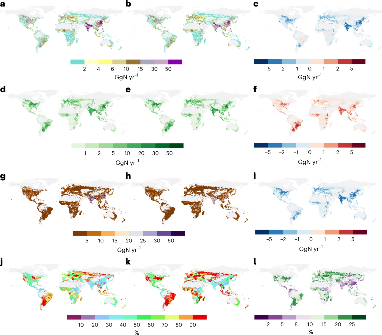 j–l,基线情景中的NUE(j),eCO2情景(k)和ΔNUE(l)。图例中的值反映了格网像元内农田的平均年氮收支量(0.5°×0.5°)。底图的应用无需 GADM 数据(https://gadm.org/)的认可。