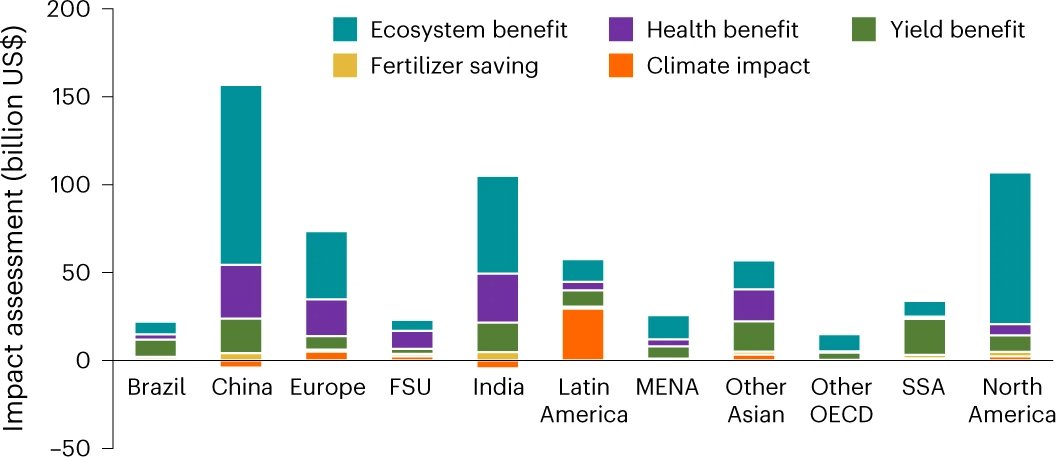 3.eCO2对耕地氮循环影响:通过避免对人类和生态系统健康的损害,将达到6680亿美元的社会效益;最大的收益预计将在中国、印度、北美和欧洲实现。