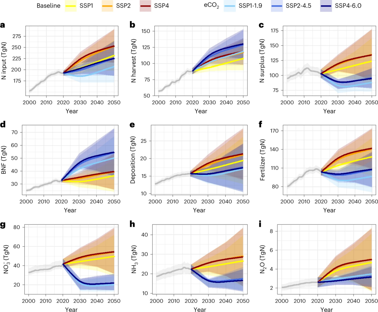 a–i,实线表示总氮输入量(a),氮收获量(b),氮盈余(Nr损失和N2) (c)、BNF(d),沉积物(e),肥料(f),NO3−(g)、NH3(h)和N2O(i),来自基线情景下全球耕地每年和CO2升高场景。阴影表示均值的标准差。