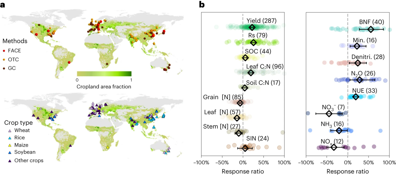 显示模拟大气CO2水平升高的实验地点分布b. 主要变量对CO2升高的反应比,基于荟萃分析。