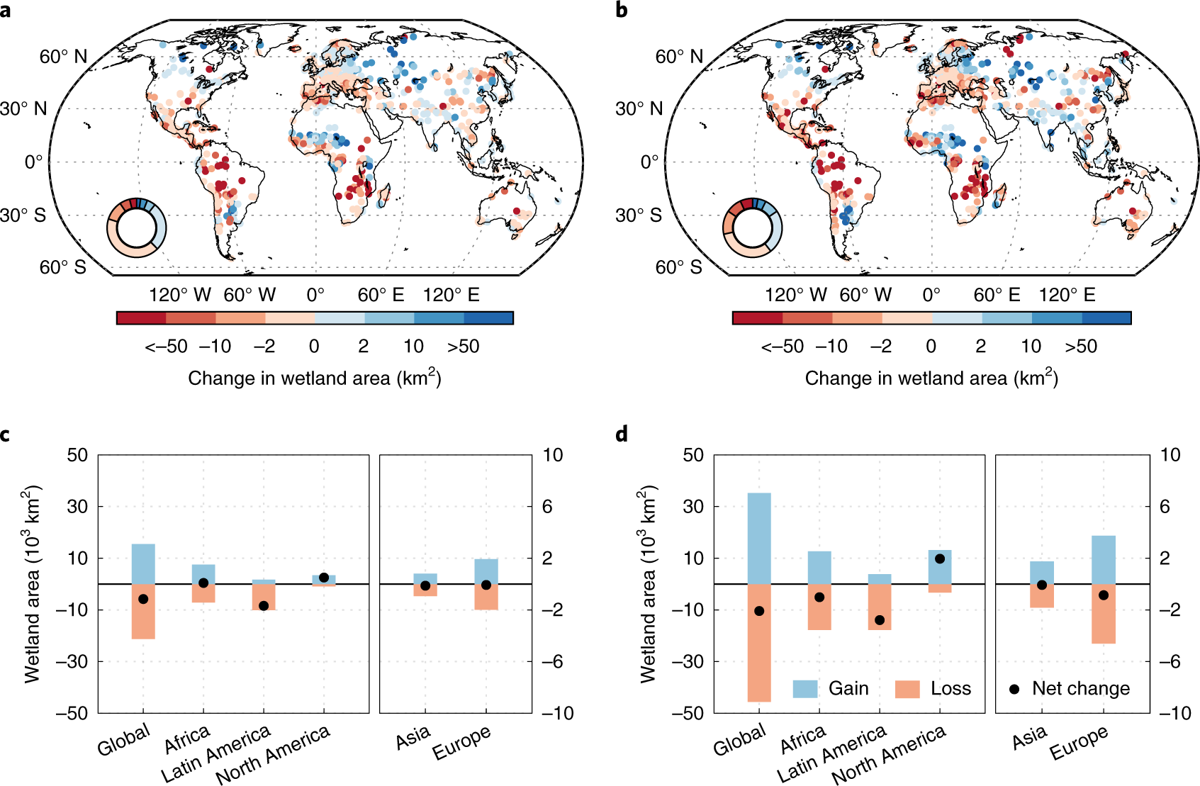 a、 b,根据CMIP5集合的RCP 2.6(13个模型)(a)和RCP 8.5(19个模型)。c、 d,根据RCP 2.6(c)和RCP 8.5(d),预计CMIP5综合平均全球和五大洲(非洲、拉丁美洲、北美、亚洲和欧洲)的绝对湿地面积变化。此处未显示大洋洲,因为该大陆的湿地总面积不到全球拉姆萨尔湿地面积的1.5%。