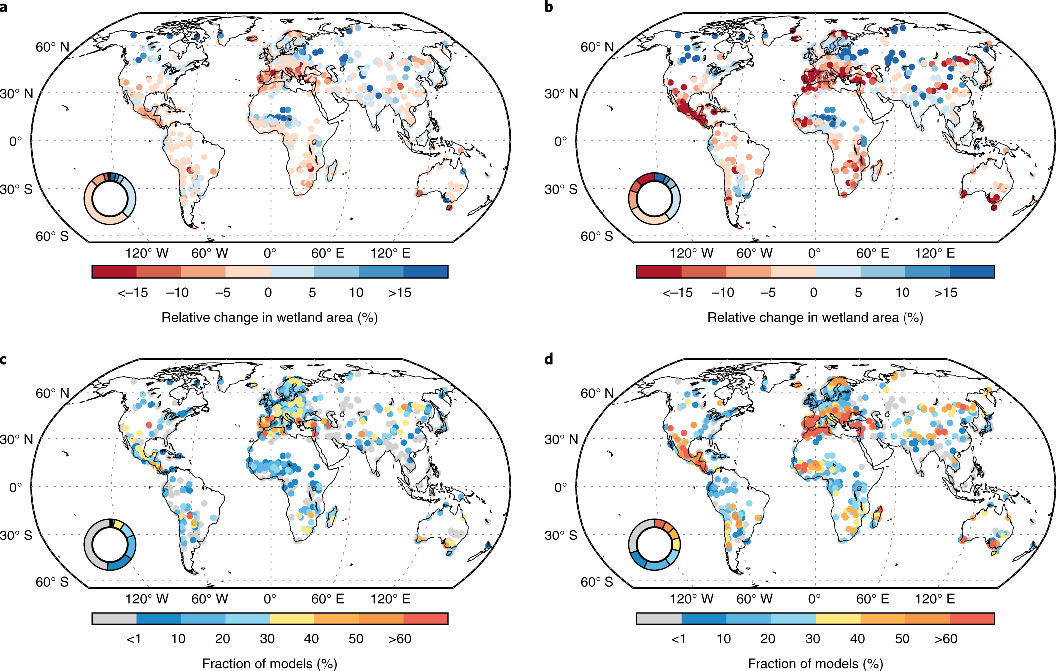 a、b、2081-2100年湿地面积预测变化,与1981-2000年参照期相比,在RCP 2.6 (13模型) (a)和RCP 8.5 (19模型)(b)下,来自全球内陆拉姆萨尔遗址的CMIP5组合。c,d,在RCP 2.6 (c)和RCP 8.5 (d)下,同意每个拉姆萨尔湿地>10%湿地损失的模型比例。