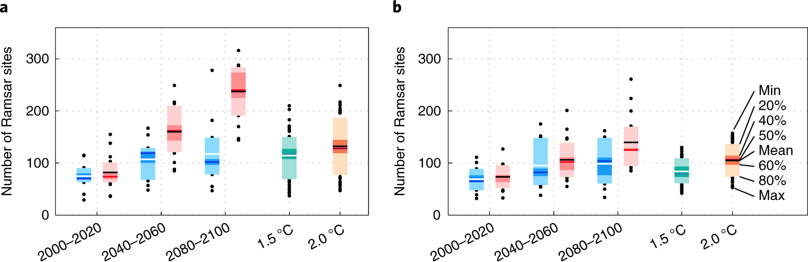 我们的分析表明,随着未来气候变暖,全球内陆拉姆萨尔湿地的湿地损失风险将增加。在四种变暖情景下,内陆拉姆萨尔湿地的丧失,气候变化对拉姆萨尔湿地的影响预计将在区域一级明显。在地中海、墨西哥和中美洲、中拉丁美洲和南非——全球生物多样性热点网络的所有部分——损失百分比远高于全球平均水平的地点。CMIP5气候模型对这些地区湿地损失的一致预测表明,由于生境丧失,生物多样性受到威胁。