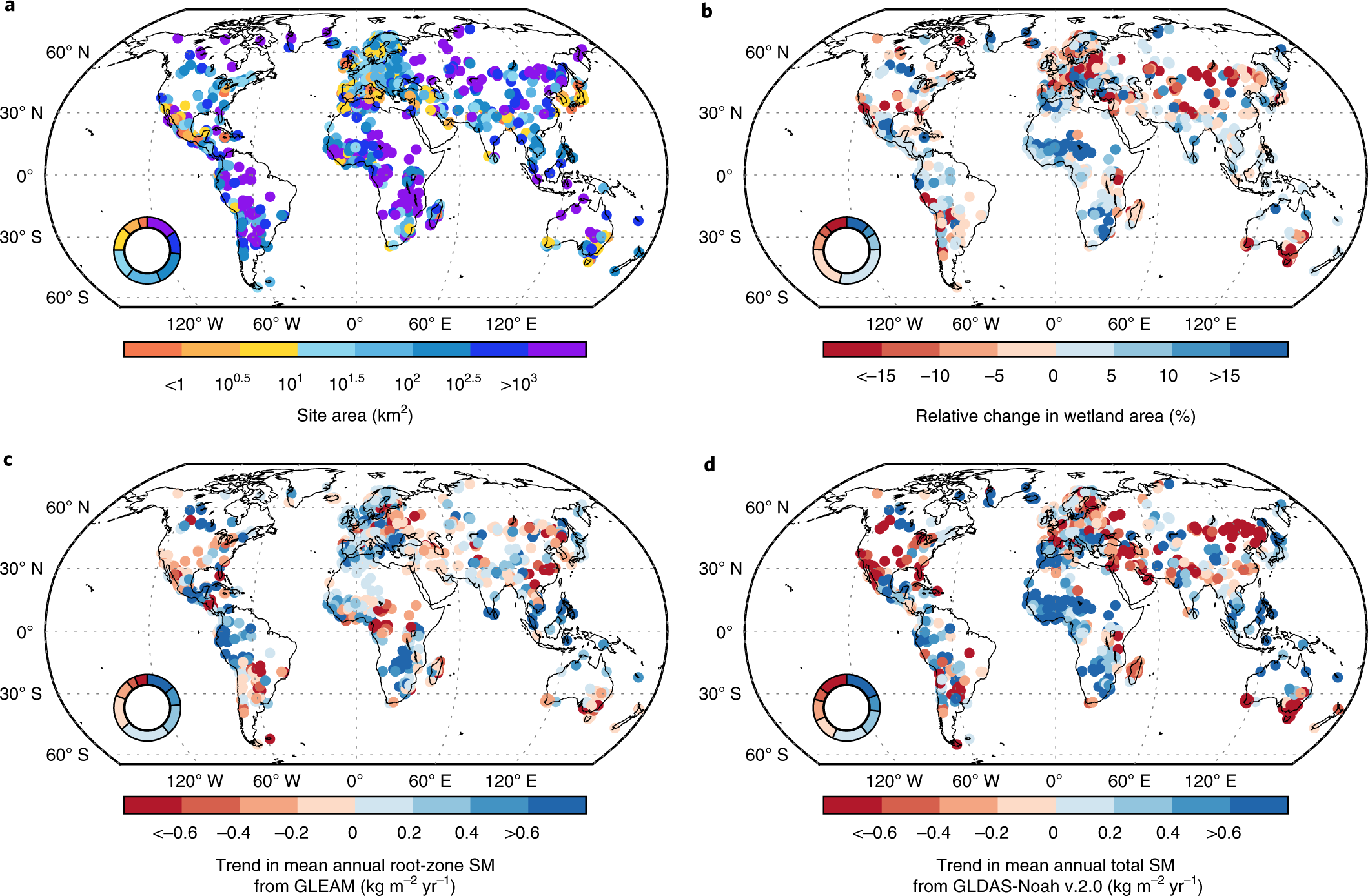 从1980年到2014年,全球内陆拉姆萨尔湿地的变化。a、 场地区域的空间格局。b、 基于GLDAS Noah v.2.0的SM模拟湿地面积变化。c、 GLEAM年平均根区SM的趋势。d、 GLDAS Noah 2.0版的年均总SM趋势。