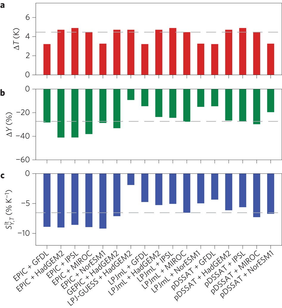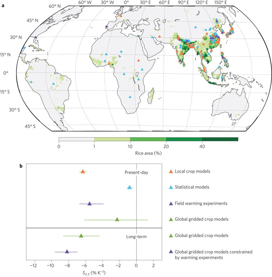 Abstract: Rice is the staple food for more than 50% of the world's population1–3. Reliable prediction of changes in rice yield is thus central for maintaining global food security. This is an extraordinary challenge. Here, we compare the sensitivity of rice yield to temperature increase derived from field warming experiments and three modelling approaches: statistical models, local crop models and global gridded crop models. Field warming experiments produce a substantial rice yield loss under warming, with an average temperature sensitivity of −5.2 ± 1.4% K−1. Local crop models give a similar sensitivity (−6.3 ± 0.4% K−1), but statistical and global gridded crop models both suggest less negative impacts of warming on yields (−0.8 ± 0.3% and −2.4 ± 3.7% K−1, respectively). Using data from field warming experiments, we further propose a conditional probability approach to constrain the large range of global gridded crop model results for the future yield changes in response to warming by the end of the century (from −1.3% to −9.3% K−1). The constraint implies a more negative response to warming (−8.3 ± 1.4% K−1) and reduces the spread of the model ensemble by 33%. This yield reduction exceeds that estimated by the International Food Policy Research Institute assessment (−4.2 to −6.4% K−1) (ref. 4). Our study suggests that without CO2 fertilization, effective adaptation and genetic improvement, severe rice yield losses are plausible under intensive climate warming scenarios.
