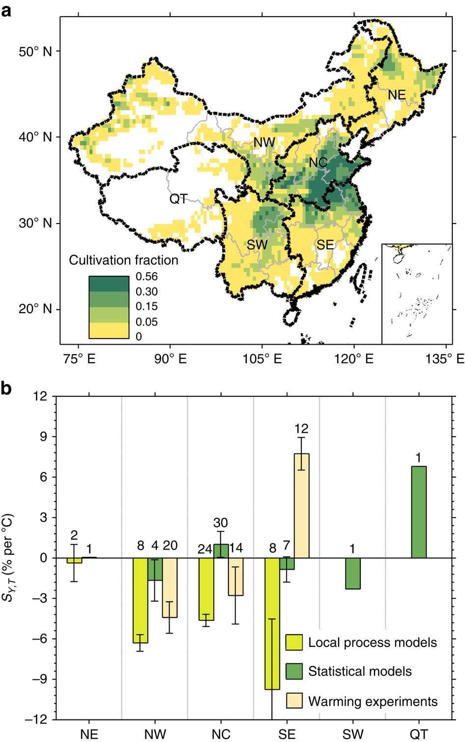 Abstract: Wheat growth is sensitive to temperature, but the effect of future warming on yield is uncertain. Here, focusing on China, we compiled 46 observations of the sensitivity of wheat yield to temperature change (SY,T, yield change per °C) from field warming experiments and 102SY,Testimates from local process-based and statistical models. The averageSY,Tfrom field warming experiments, local process-based models and statistical models is −0.7±7.8(±s.d.)% per °C, −5.7±6.5% per °C and 0.4±4.4% per °C, respectively. Moreover,SY,Tis different across regions and warming experiments indicate positiveSY,Tvalues in regions where growing-season mean temperature is low, and water supply is not limiting, and negative values elsewhere. Gridded crop model simulations from the Inter-Sectoral Impact Model Intercomparison Project appear to capture the spatial pattern ofSY,Tdeduced from warming observations. These results from local manipulative experiments could be used to improve crop models in the future.