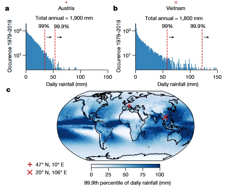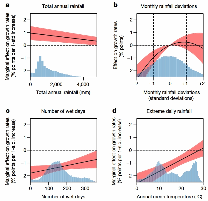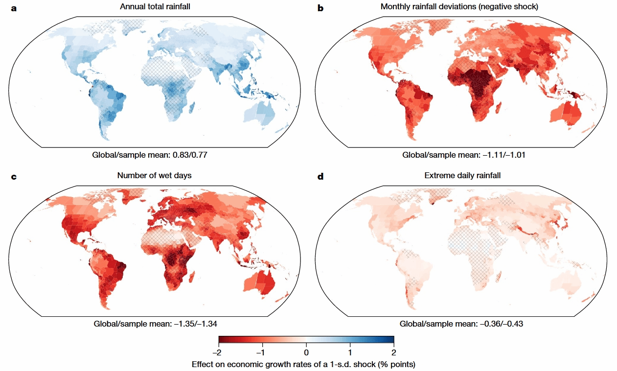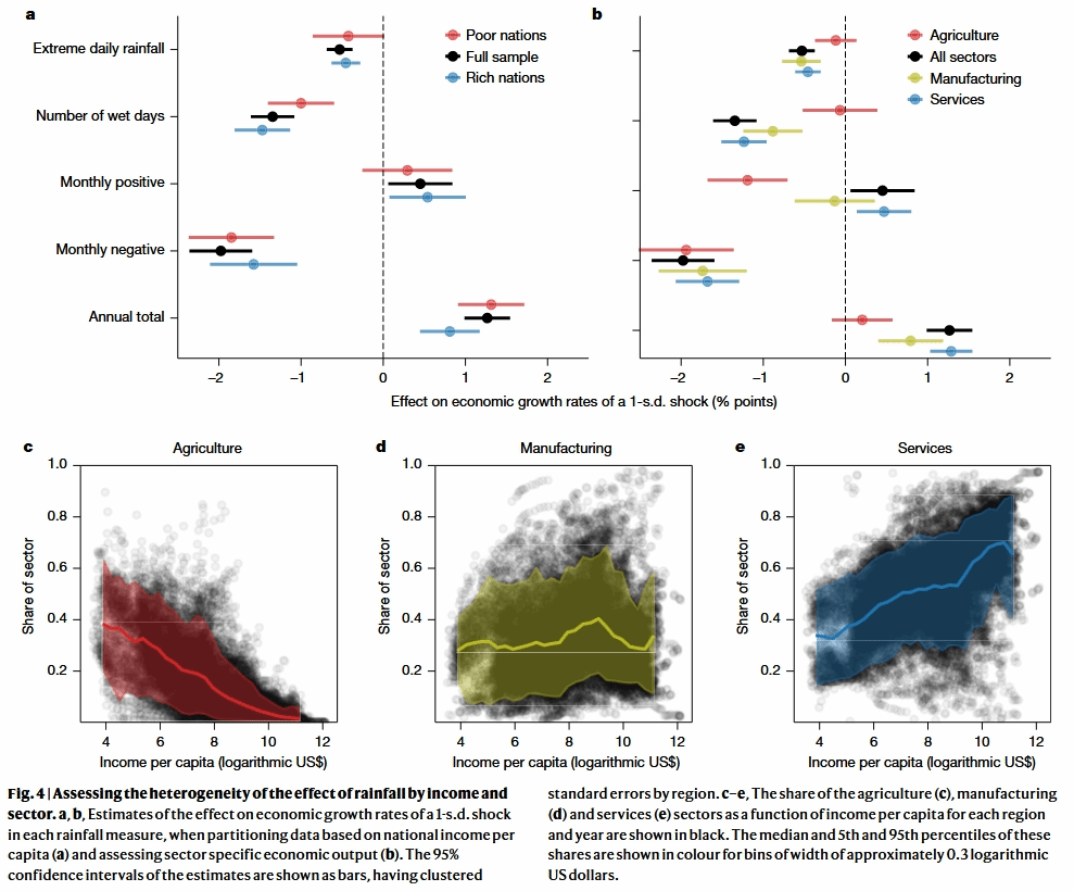 Abstract: Macro-economic assessments of climate impacts lack an analysis of the distribution of daily rainfall, which can resolve both complex societal impact channels and anthropogenically forced changes1–6. Here, using a global panel of subnational economic output for 1,554 regions worldwide over the past 40 years, we show that economic growth rates are reduced by increases in the number of wet days and in extreme daily rainfall, in addition to responding nonlinearly to the total annual and to the standardized monthly deviations of rainfall. Furthermore, high-income nations and the services and manufacturing sectors are most strongly hindered by both measures of daily rainfall, complementing previous work that emphasized the beneficial effects of additional total annual rainfall in low-income, agriculturally dependent economies4,7. By assessing the distribution of rainfall at multiple timescales and the effects on different sectors, we uncover channels through which climatic conditions can affect the economy. These results suggest that anthropogenic intensification of daily rainfall extremes8–10 will have negative global economic consequences that require further assessment by those who wish to evaluate the costs of anthropogenic climate change.