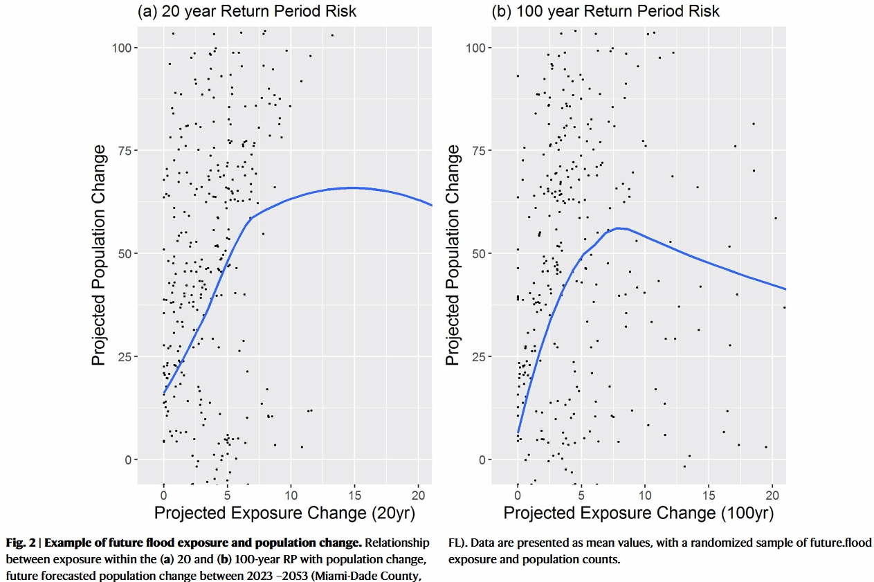 Abstract: Flood exposure has been linked to shifts in population sizes and composition. Traditionally, these changes have been observed at a local level providing insight to local dynamics but not general trends, or at a coarse resolution that does not capture localized shifts. Using historic flood data between 2000-2023 across the Contiguous United States (CONUS), we identify the relationships between flood exposure and population change. We demonstrate that observed declines in population are statistically associated with higher levels of historic flood exposure, which may be subsequently coupled with future population projections. Several locations have already begun to see population responses to observed flood exposure and are forecasted to have decreased future growth rates as a result. Finally, we find that exposure to high frequency flooding (5 and 20-year return periods) results in 2-7% lower growth rates than baseline projections. This is exacerbated in areas with relatively high exposure to frequent flooding where growth is expected to decline over the next 30 years.