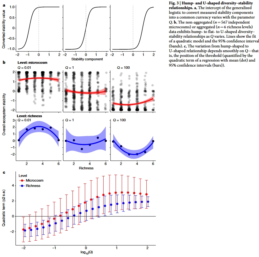 Abstract: Losses and gains in species diversity affect ecological stability1–7 and the sustainability of ecosystem functions and services8–13. Experiments and models have revealed positive, negative and no effects of diversity on individual components of stability, such as temporal variability, resistance and resilience2,3,6,11,12,14. How these stability components covary remains poorly understood15. Similarly, the effects of diversity on overall ecosystem stability16, which is conceptually akin to ecosystem multifunctionality17,18, remain unknown. Here we studied communities of aquatic ciliates to understand how temporal variability, resistance and overall ecosystem stability responded to diversity (that is, species richness) in a large experiment involving 690 micro-ecosystems sampled 19 times over 40 days, resulting in 12,939 samplings. Species richness increased temporal stability but decreased resistance to warming. Thus, two stability components covaried negatively along the diversity gradient. Previous biodiversity manipulation studies rarely reported such negative covariation despite general predictions of the negative effects of diversity on individual stability components3. Integrating our findings with the ecosystem multifunctionality concept revealed hump- and U-shaped effects of diversity on overall ecosystem stability. That is, biodiversity can increase overall ecosystem stability when biodiversity is low, and decrease it when biodiversity is high, or the opposite with a U-shaped relationship. The effects of diversity on ecosystem multifunctionality would also be hump- or U-shaped if diversity had positive effects on some functions and negative effects on others. Linking the ecosystem multifunctionality concept and ecosystem stability can transform the perceived effects of diversity on ecological stability and may help to translate this science into policy-relevant information.