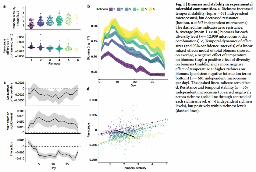 文章信息:Frank Pennekamp, Mikael Pontarp, Andrea Tabi, Florian Altermatt, Roman Alther, Yves Choffat, Emanuel A. Fronhofer, Pravin Ganesanandamoorthy, Aurélie Garnier, Jason I. Griffiths, Suzanne Greene, Katherine Horgan, Thomas M. Massie, Elvira Mächler, Gian Marco Palamara, Mathew Seymour, & Owen L. Petchey. (2018). Biodiversity increases and decreases ecosystem stability. Nature, 563(7731), 109–112. https://doi.org/10.1038/s41586-018-0627-8