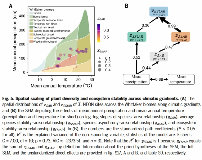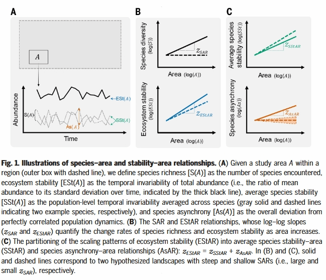 物种丰富度和生态系统稳定性都随面积增加而增加,分别由物种-面积关系(SAR)和生态系统稳定性-面积关系(EStAR)描述。将这些空间尺度模式整合起来,有助于我们从较小区域扩展到较大区域的生物多样性-稳定性关系,并预测生物多样性和生态系统稳定性对栖息地丧失和人为环境变化的响应。
