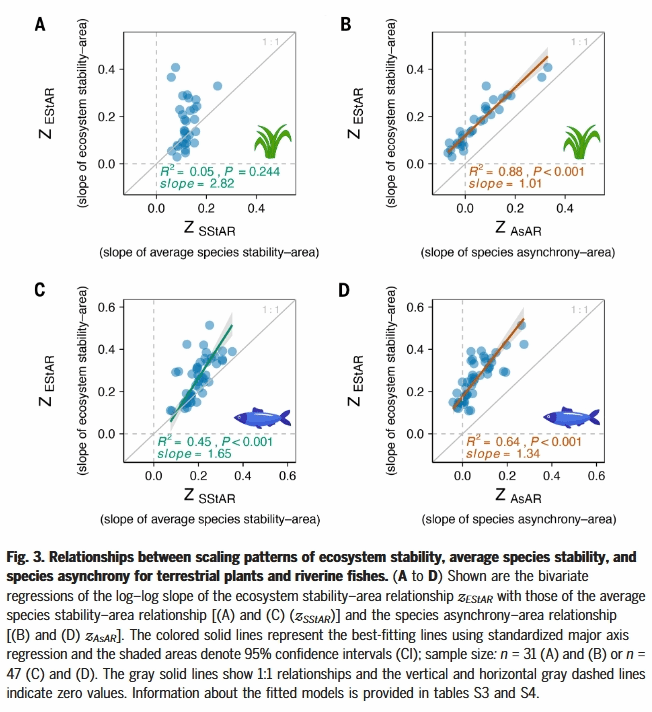 基于观察到的EStAR变化,预计栖息地破坏对植物和鱼类群落的稳定化效应在更具生物多样性的地点(即具有更大的zSAR)会更明显。对于植物群落,在更湿润的地区(显示出更大的zEStAR),栖息地丧失可能对生态系统稳定性产生更显著的负面影响。