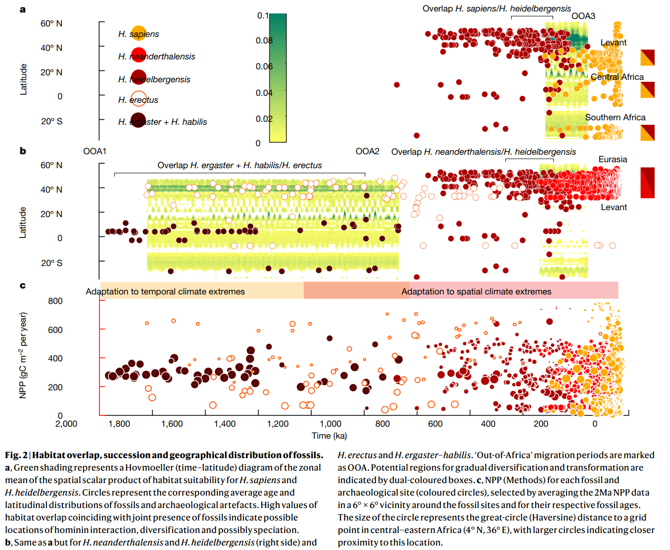a,绿色阴影代表了智人和海德堡人生境适宜性的空间标量乘积的霍夫默勒图(气象学中用于描述波运动的一种常见绘图方法)(时间纬度)图。圆圈代表相应的平均年代,以及化石和考古文物的纬度分布。栖息地重叠的高值与化石的共同存在表明可能存在人与人之间的相互作用、多样化和可能的物种形成的地点。