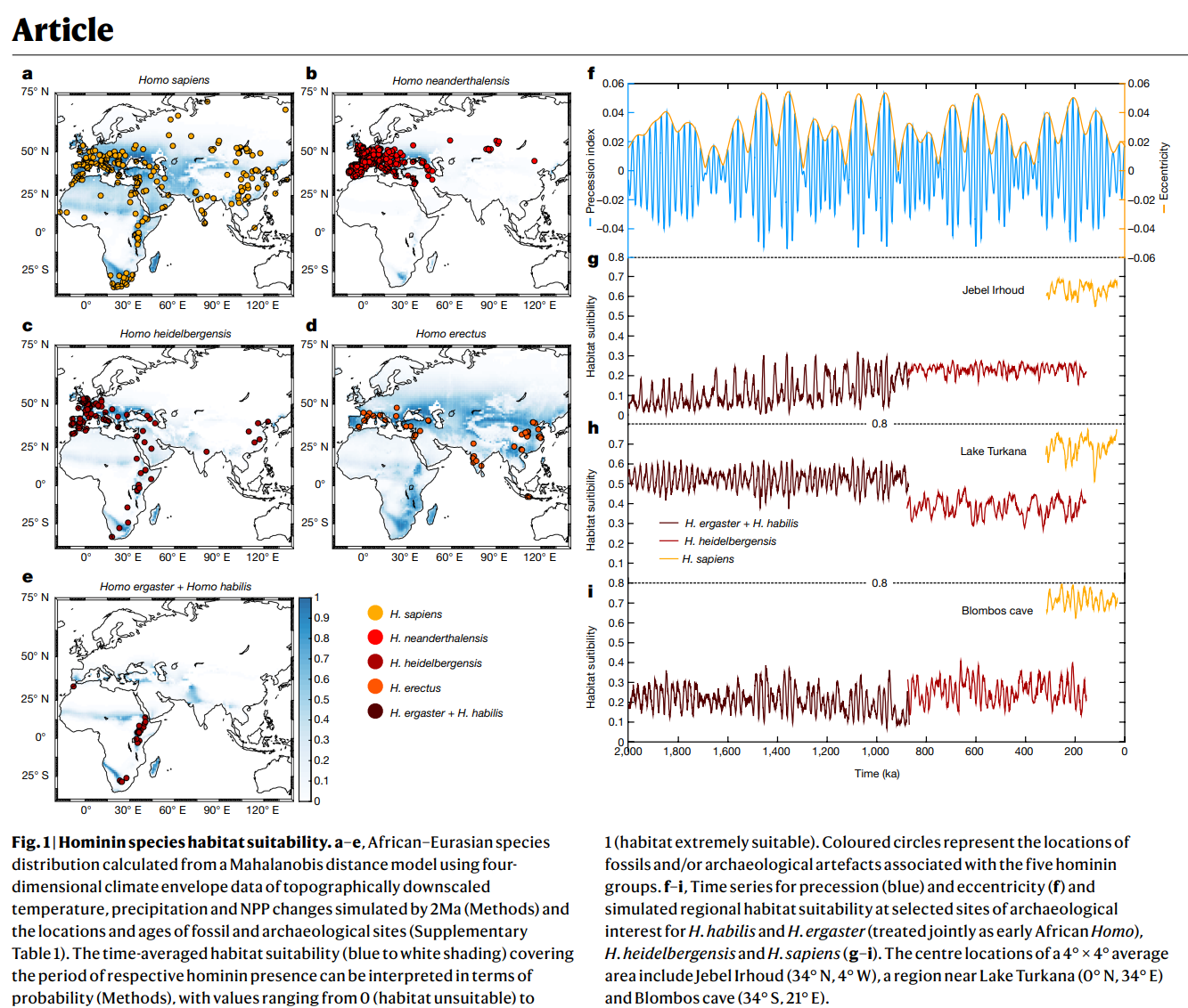 非洲-欧亚大陆的物种分布,由Mahalanobis距离模型计算得出,使用四维气候包络数据,即2Ma(方法)模拟的地形降尺度温度、降水和NPP变化(植物净初级生产力)以及化石和考古遗址的位置和年代(补充表1)。覆盖各自人类存在时期的时间平均栖息地适宜性(蓝色到白色阴影)可以用概率(方法)来解释,其值从0(栖息地不适宜)到1(栖息地极其适宜)。彩色的圆圈代表化石的位置和/或与五个人类群体有关的考古文物。f-i, 前移(蓝色)和偏心(f)的时间序列,以及在选定的具有考古意义的地点模拟的哈比利斯人和埃加斯特人(被共同视为非洲早期智人)、海德堡人和智人的区域生境适宜性(g-i)。一个4°×4°的平均区域的中心位置包括杰贝尔依罗人(北纬34度,西经4度),图尔卡纳湖附近的一个区域(北纬0度,东经34度) 和布隆伯斯洞窟(南纬34°,东经21°)。
