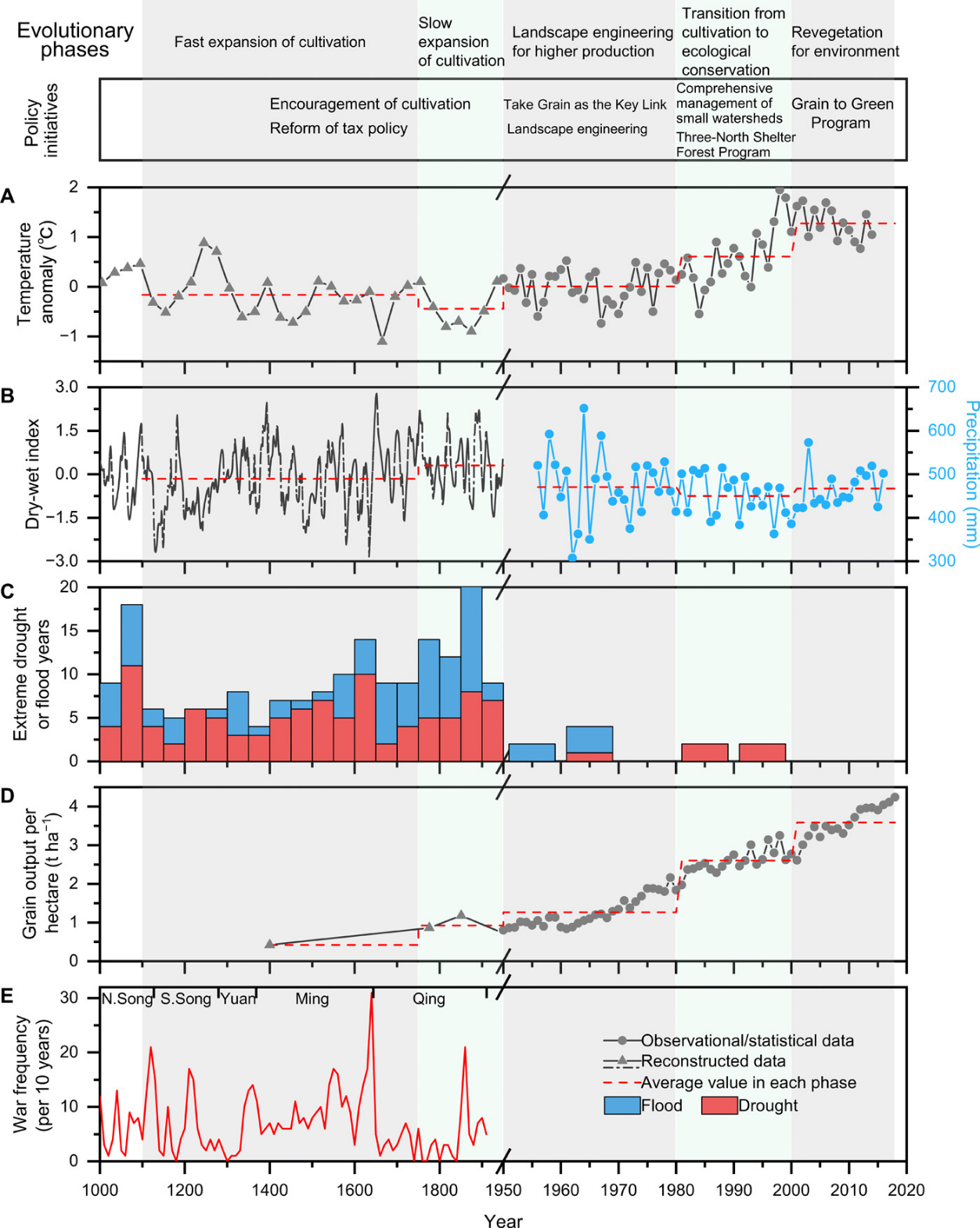 为反映SES的复杂性,选择可能影响社会生态互动的政治,气候和社会经济驱动因素。气候驱动因素包括温度异常,历史时期的典型降水指数,1949年后记录的降水以及极端干旱和洪水事件。社会经济驱动因素包括农业技术和管理水平(由每公顷谷物产量反映),战争频率以及黄土高原上农牧业边界的变化。在公开发表的文献的基础上,还对政策重点和税收政策改革等政策举措进行了定性分析。