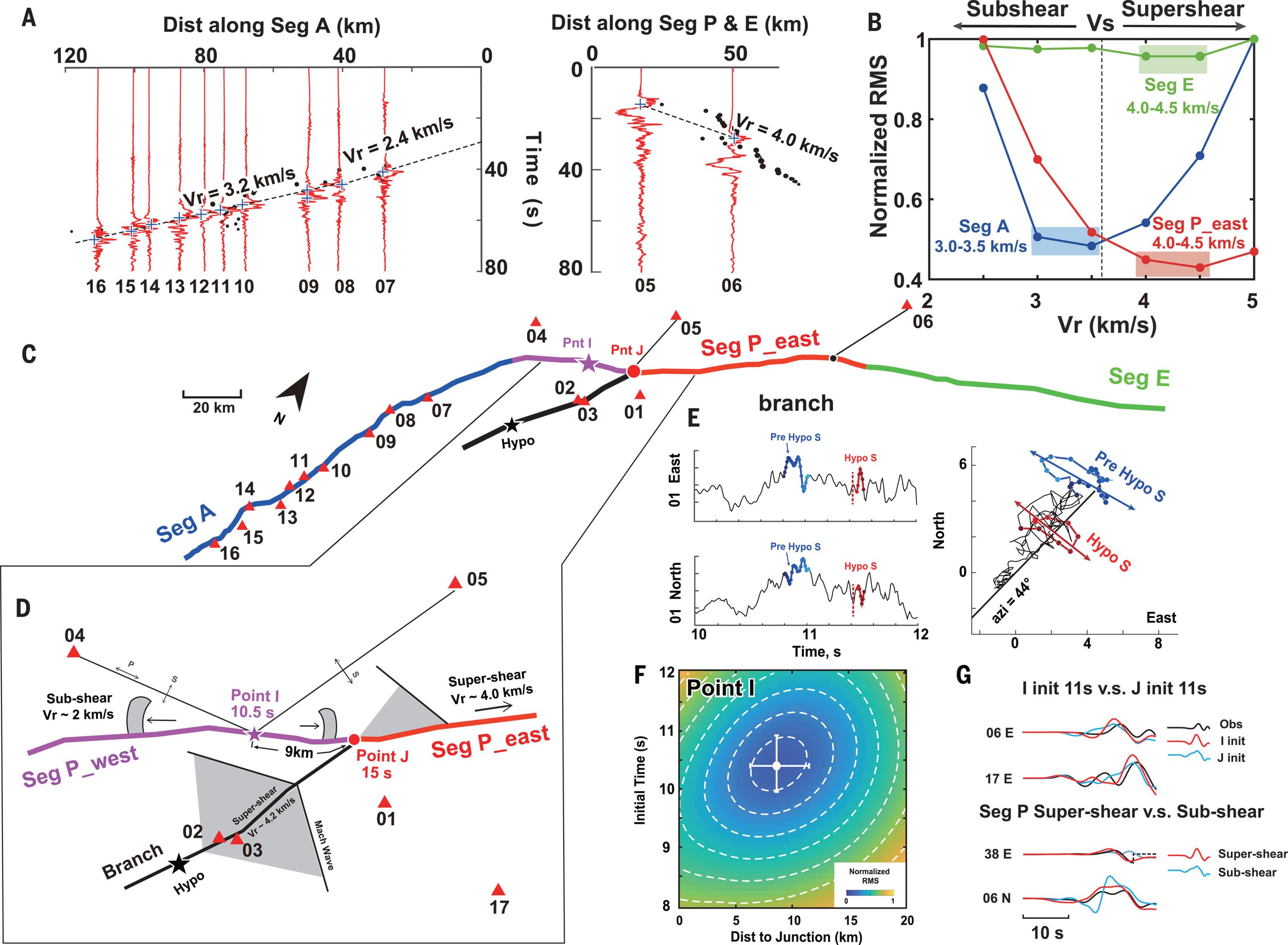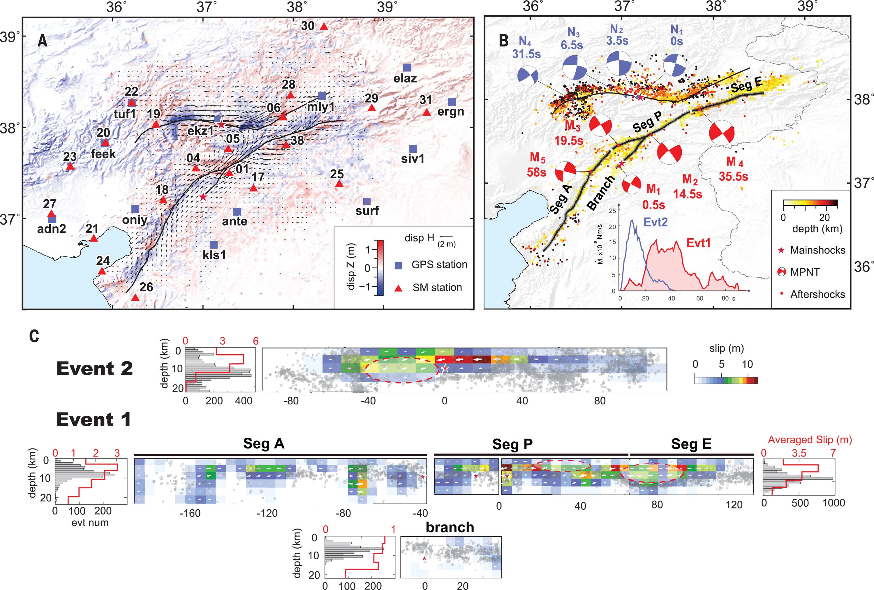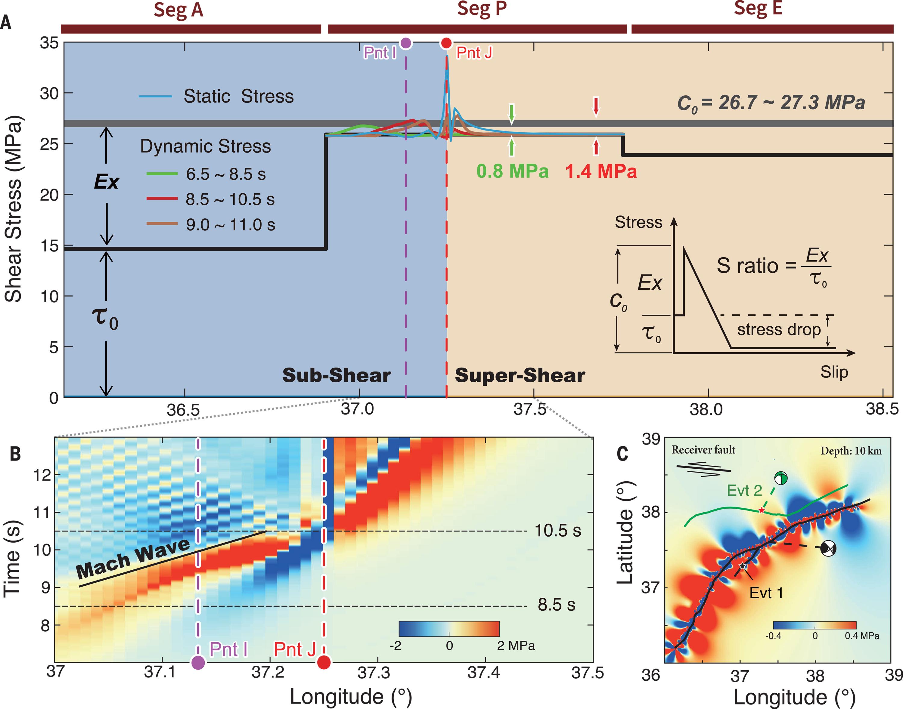 Abstract: On 6 February 2023, two large earthquakes (moment magnitude 7.8 and 7.6) shocked a vast area of southeastern Türkiye and northern Syria, leading to heavy casualties and economic loss. To investigate the rupture process over multiple fault segments, we performed a comprehensive analysis of local seismic and geodetic data and determined supershear ruptures on the initial branch and the Pazarcık and Erkenek segments and subshear ruptures on the Amanos segment of event 1. The bilateral rupture of event 2 also presents distinct sub- and supershear velocities. The dynamic stress of the branch fault rupture triggered the Pazarcık segment initial rupture at a point 9 kilometers west of the junction of these two faults, boosting the supershear rupture of the Pazarcık segment of the main fault. The geometry and prestress level of multiple segments controlled the rupture behaviors and influenced the ground shaking intensity.