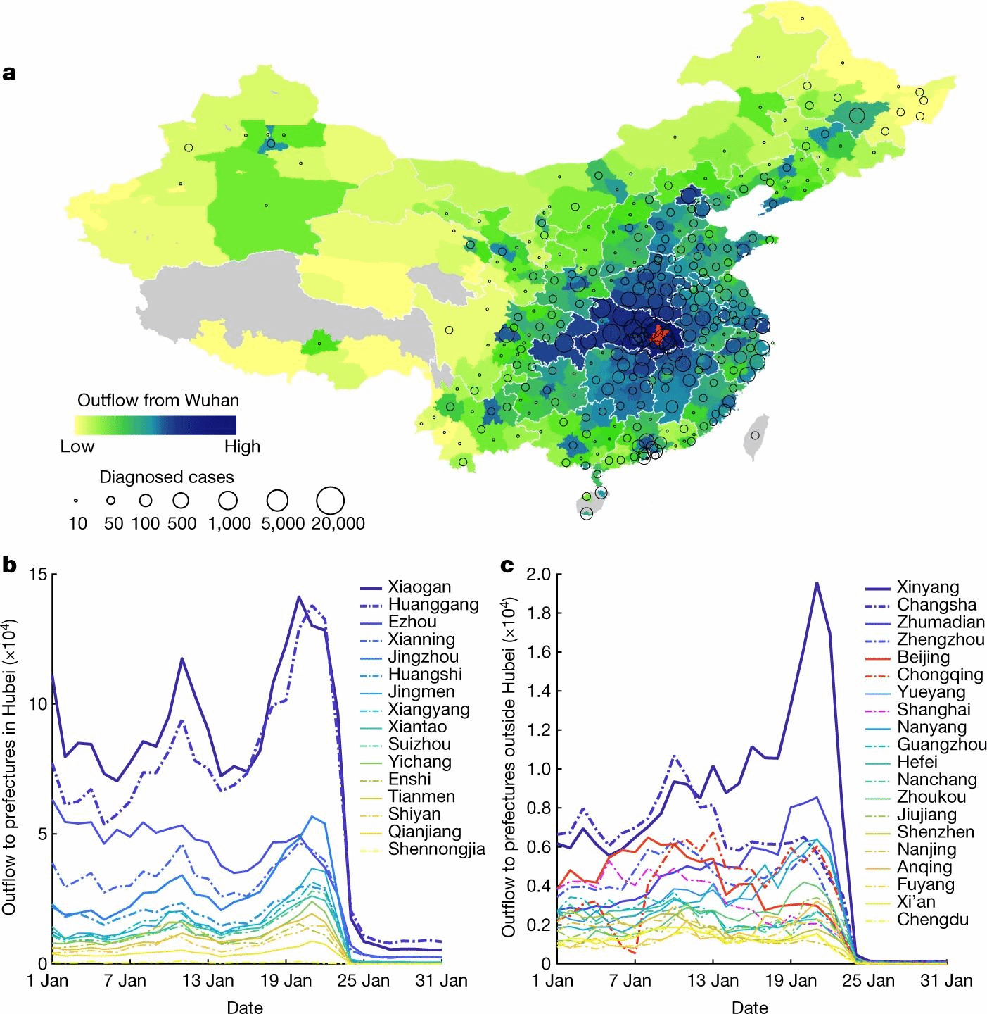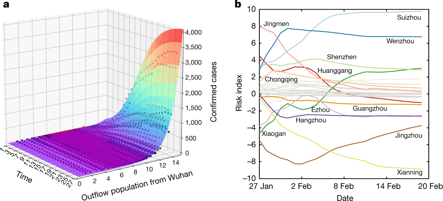 Abstract: Sudden, large-scale and diffuse human migration can amplify localized outbreaks of disease into widespread epidemics1,2,3,4. Rapid and accurate tracking of aggregate population flows may therefore be epidemiologically informative. Here we use 11,478,484 counts of mobile phone data from individuals leaving or transiting through the prefecture of Wuhan between 1 January and 24 January 2020 as they moved to 296 prefectures throughout mainland China. First, we document the efficacy of quarantine in ceasing movement. Second, we show that the distribution of population outflow from Wuhan accurately predicts the relative frequency and geographical distribution of infections with severe acute respiratory syndrome coronavirus 2 (SARS-CoV-2) until 19 February 2020, across mainland China. Third, we develop a spatio-temporal ‘risk source’ model that leverages population flow data (which operationalize the risk that emanates from epidemic epicentres) not only to forecast the distribution of confirmed cases, but also to identify regions that have a high risk of transmission at an early stage. Fourth, we use this risk source model to statistically derive the geographical spread of COVID-19 and the growth pattern based on the population outflow from Wuhan; the model yields a benchmark trend and an index for assessing the risk of community transmission of COVID-19 over time for different locations. This approach can be used by policy-makers in any nation with available data to make rapid and accurate risk assessments and to plan the allocation of limited resources ahead of ongoing outbreaks.