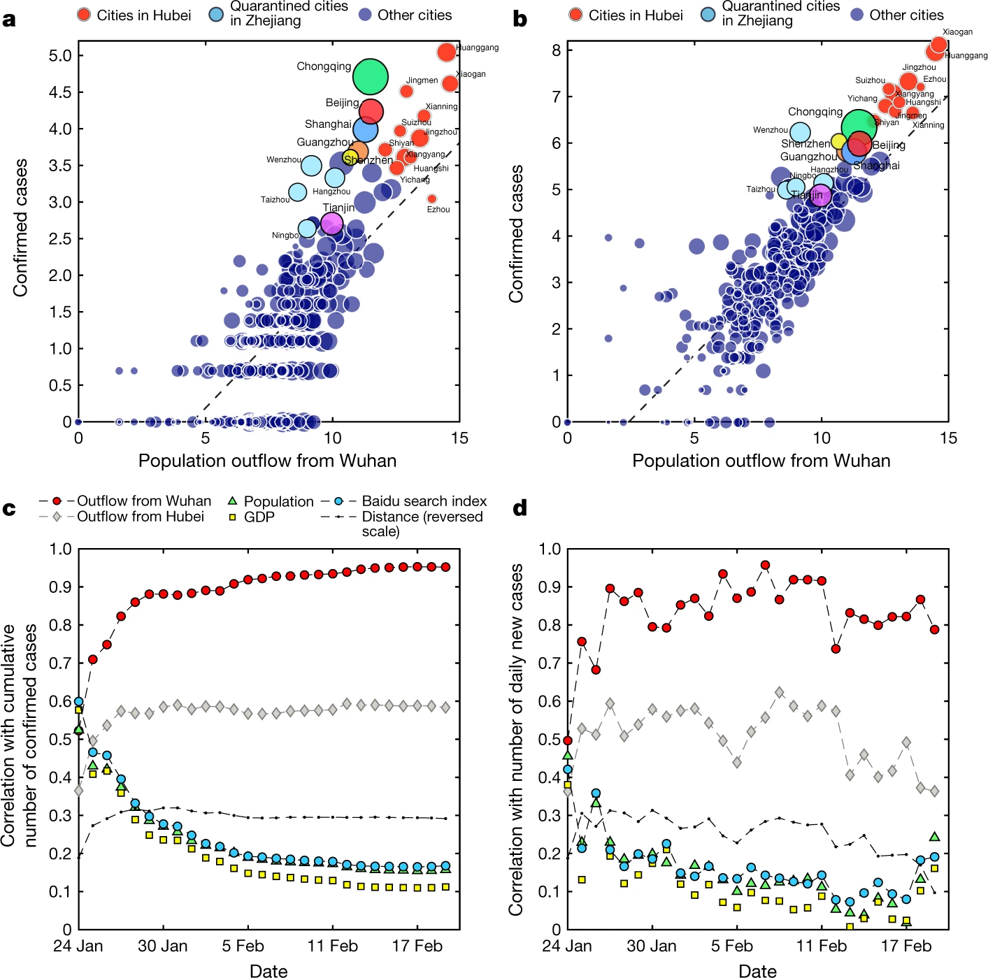 红圈是湖北的州;浅蓝色圆圈表示浙江省(包括温州)的四个隔离州;中国六大地级市以独特的颜色标示。c、 确诊病例数(累计至2020年2月19日)与来自武汉的累计人口流入量(截至2020年1月24日)、来自湖北省(不包括武汉)的累计流入量、与病毒相关的百度搜索词频率、各省的GDP、人口和与武汉的距离随时间的关系。随着时间的推移,武汉的人口外流与感染病例数之间的相关性从2020年1月24日的皮尔逊r=0.522增加到2月19日的r=0.952(n=296个县)。在线搜索行为预测强度的下降可能反映了信息饱和,而GDP、人口规模和距离预测强度的降低表明,后期春云从武汉迁移到更多样化的州(而不仅仅是最隐秘、最大和最发达的州)和/或社区传播开始占主导地位。d、 在整个期间,与每日感染的相关性是一致的,Pearson的r范围从2020年1月24日的0.496到2020年2月4日的峰值0.926(n=296个县)。波动可能表明案件报告滞后(在c中已平滑);过去几天相关性较弱,反映出湖北以外90%以上的地级市没有报告新病例。