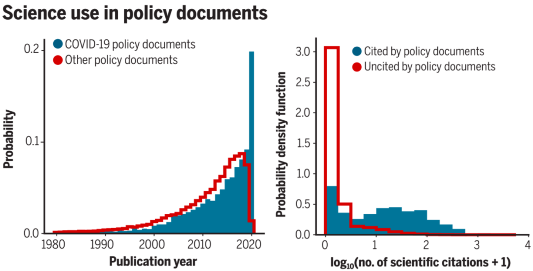 左图:被政策文件参考的科学论文的发表时间。从时间轴来看,与COVID-19相关的政策文件更倾向于参考最新(2020 年) 发表的科学论文。右图:被政策文件所参考的科学论文在学术界内部的引用数更大。