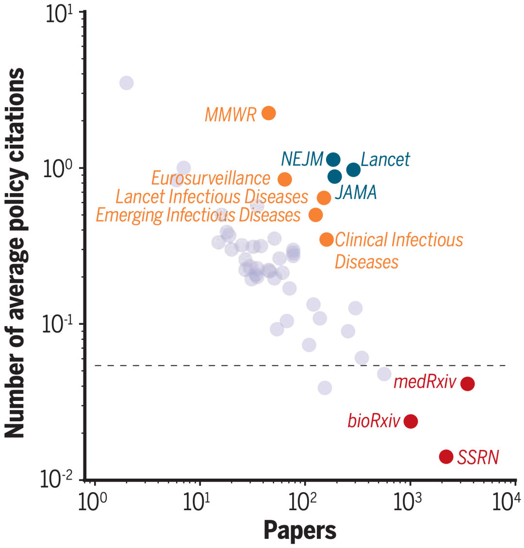 以期刊和预印本网站为载体,图中展示了 COVID-19 相关科学论文被政策文件所引用的情况。