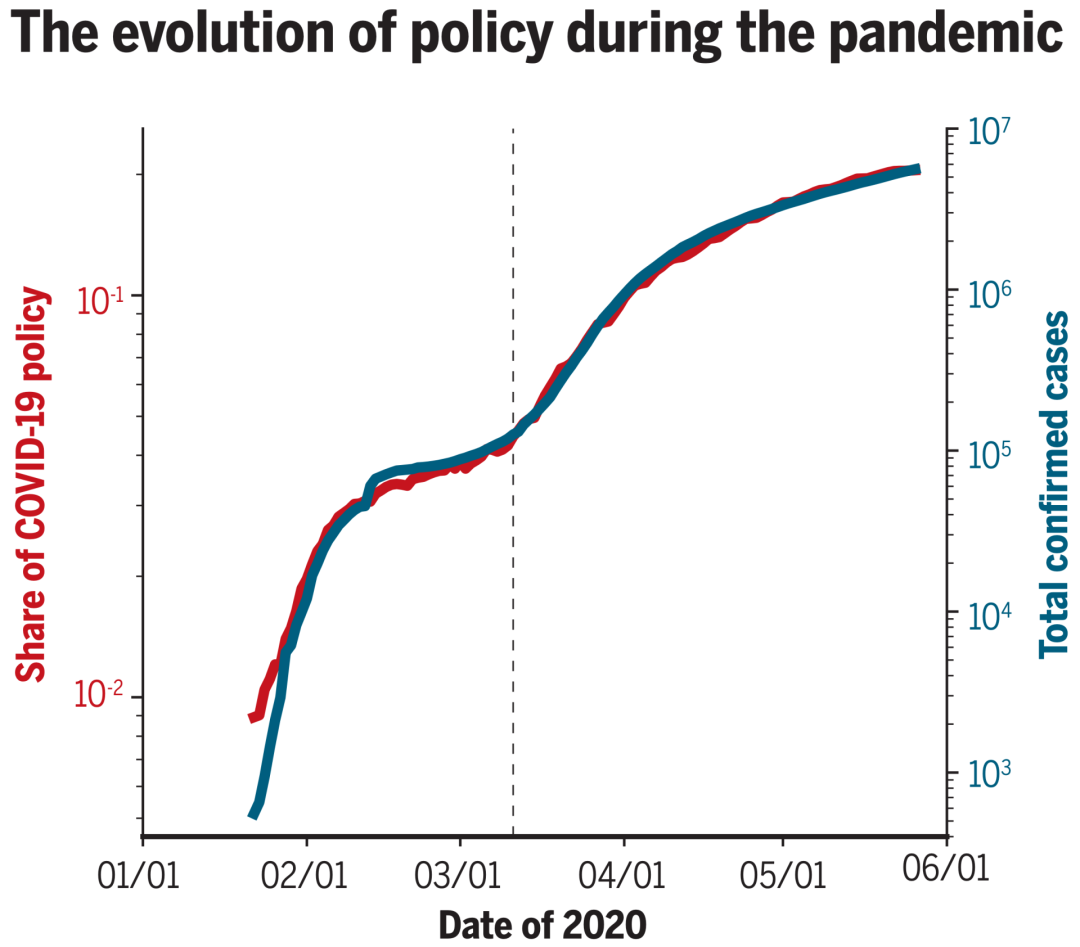 图 COVID-19 政策文件在所有政策文件中所占比例(红线)与约翰斯·霍普金斯大学追踪到的全球确诊病例数(蓝线)的同步关系。