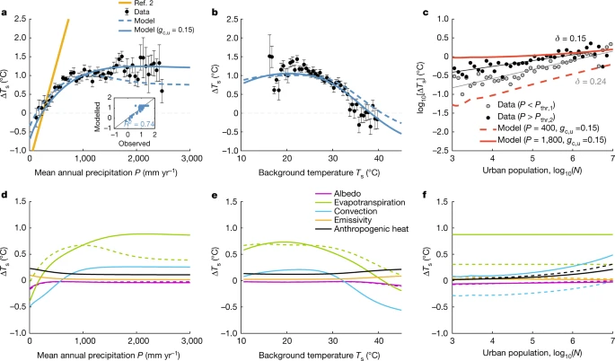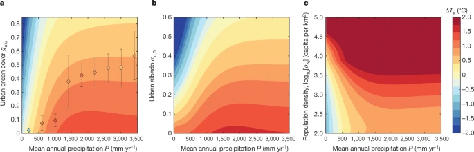 Abstract: Urban heat islands (UHIs) exacerbate the risk of heat-related mortality associated with global climate change. The intensity of UHIs varies with population size and mean annual precipitation, but a unifying explanation for this variation is lacking, and there are no geographically targeted guidelines for heat mitigation. Here we analyse summertime differences between urban and rural surface temperatures (ΔTs) worldwide and find a nonlinear increase in ΔTs with precipitation that is controlled by water or energy limitations on evapotranspiration and that modulates the scaling of ΔTs with city size. We introduce a coarse-grained model that links population, background climate, and UHI intensity, and show that urban–rural differences in evapotranspiration and convection efficiency are the main determinants of warming. The direct implication of these nonlinearities is that mitigation strategies aimed at increasing green cover and albedo are more efficient in dry regions, whereas the challenge of cooling tropical cities will require innovative solutions.