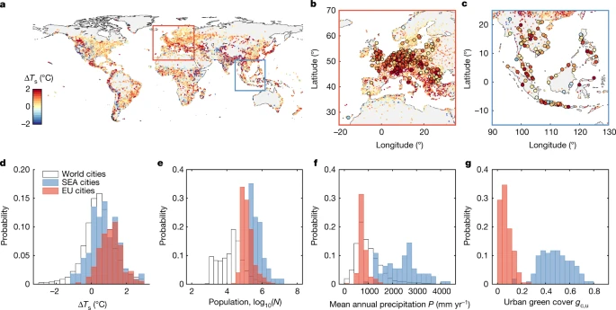 a-c,世界城市(a)、欧盟(b)和东南亚(c)夏季UHI强度图。d–g,ΔTs(d)、人口N(e)、年平均降水量P(f)和城市绿地覆盖率gc、u(g)的观测概率分布。b、c中的大圆圈表示有绿色覆盖数据20,22的城市,用于计算d-gSource数据中的统计数据。