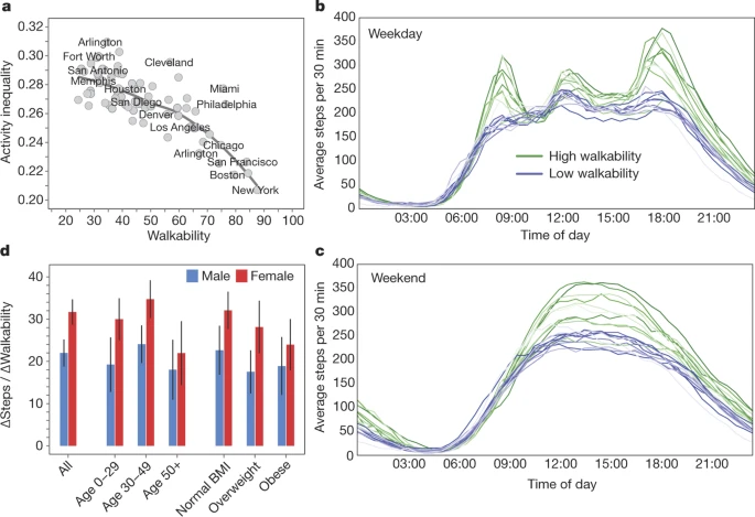 a、 根据美国69个城市的数据,较高的步行能力得分与较低的活动不平等有关(LOESS拟合;R2=0.61)。b、 c、步行能力与活动水平的提高有关。曲线显示了美国城市全天记录的平均步数,在我们的数据集中,前十名的步行能力得分(绿色)和后十名的行走能力得分(蓝色)。b、 在工作日,步行城市在上午通勤(9:00)、晚上通勤(18:00)和午餐时间(12:00)的活动激增,而在步行较少的城市,活动相对稳定,总体较低。c、 在周末,在更适合步行的城市,人们在一天中会走更多的步,因此即使在大多数人不工作或通勤的时候,步行能力也与更高的活动水平有关。d、 更高的步行能力与不同年龄、性别和BMI群体的每日步数有关。条形图显示了美国24个城市步行能力得分每增加一点,每天所获得的步数,包括95%的置信区间(假设线性模型;方法)。所有条形图的正值表明,随着步行能力的提高,每个子组都采取了更多的步骤(学生t检验,所有P<10-6)。总体而言,女性的影响明显更大(左;学生t检验P<10−4),50岁以下女性(中)和BMI小于30的个体(右)的增幅最大。