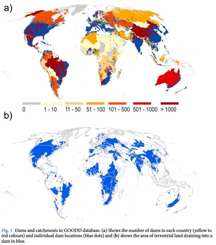 Abstract: By presenting the most comprehensive GlObal geOreferenced Database of Dams to date containing more than 38,000 dams as well as their associated catchments, we enable new and improved global analyses of the impact of dams on society and environment and the impact of environmental change (for example land use and climate change) on the catchments of dams. This paper presents the development of the global database through systematic digitisation of satellite imagery globally by a small team and highlights the various approaches to bias estimation and to validation of the data. The following datasets are provided (a) raw digitised coordinates for the location of dam walls (that may be useful for example in machine learning approaches to dam identification from imagery), (b) a global vector file of the watershed for each dam.