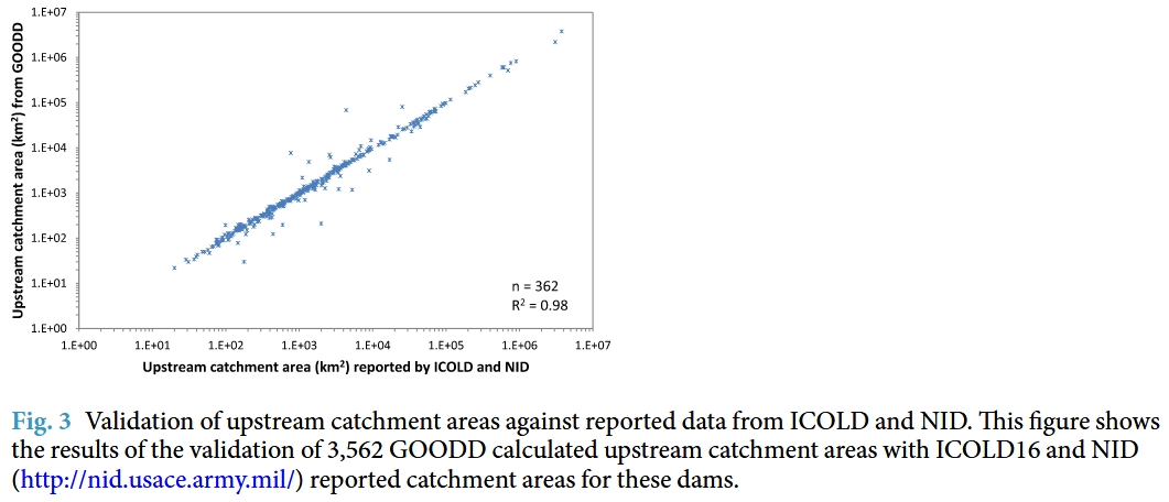 03 根据 ICOLD 和 NID 报告的数据验证上游集水区。该图显示了 3,562 个 GOODD 计算的上游集水区与 ICOLD16 和 NID 报告的这些水坝集水区的验证结果