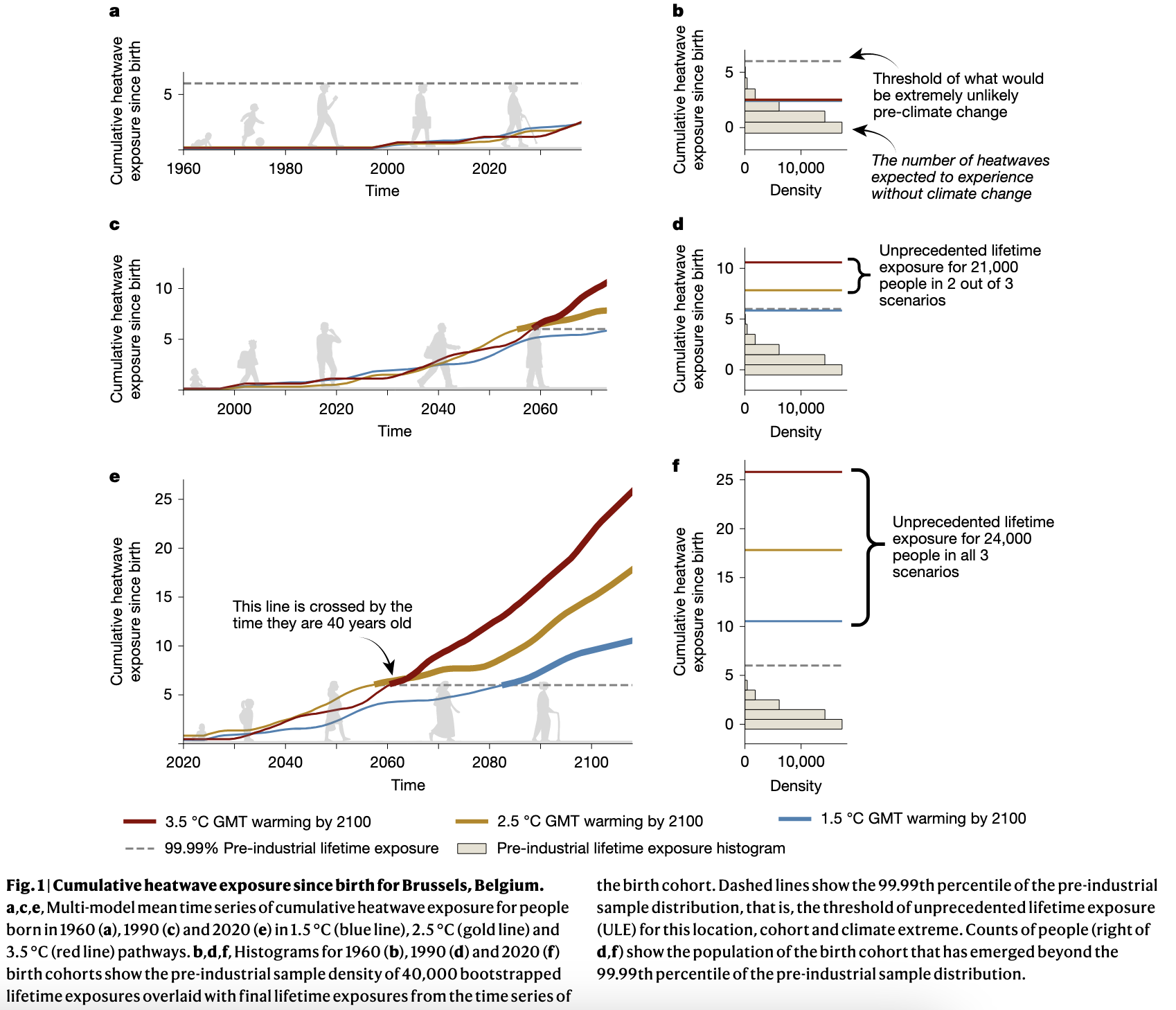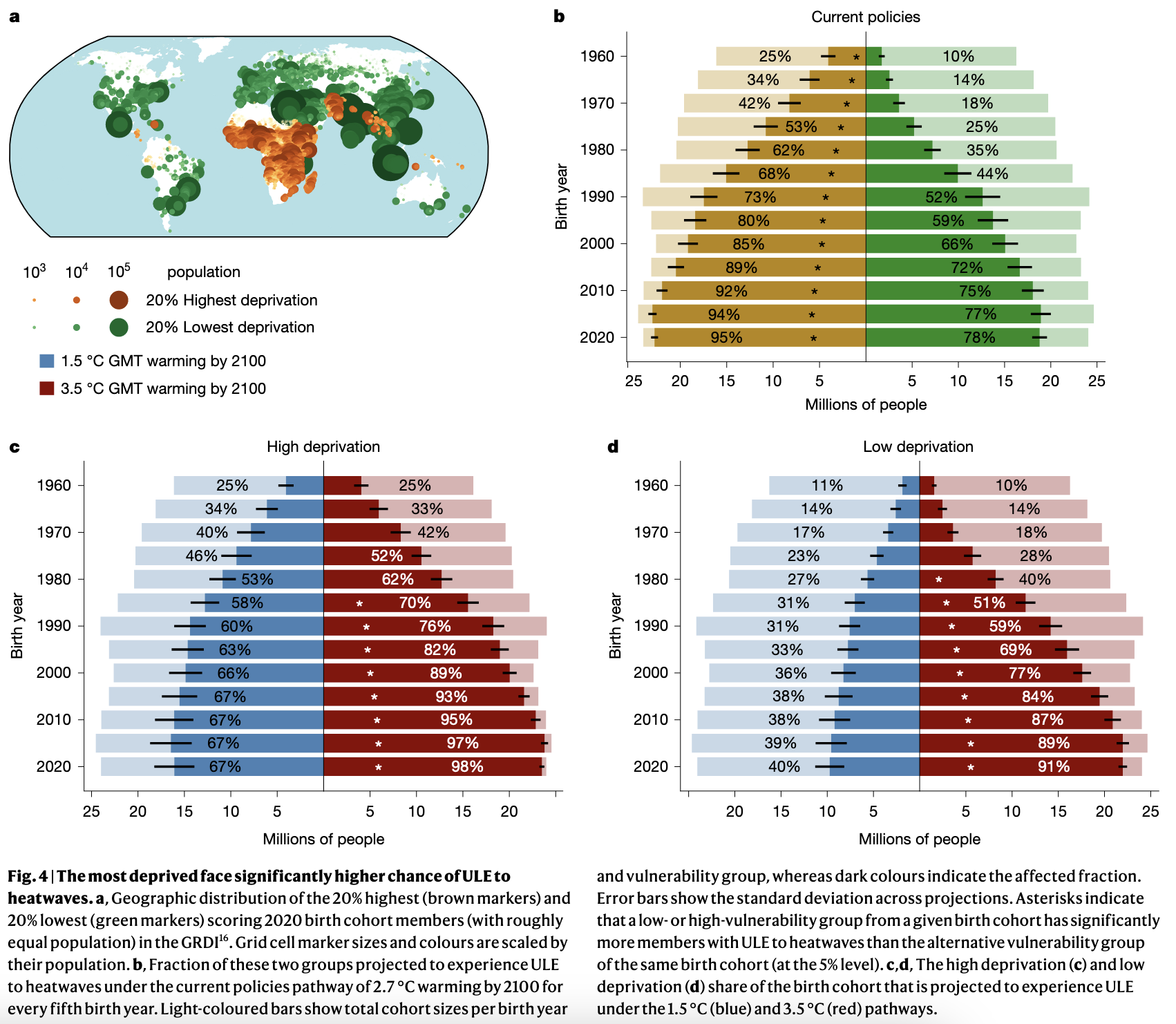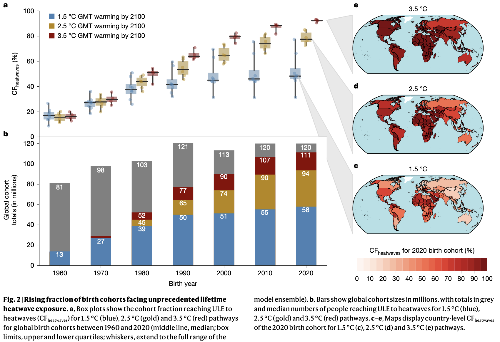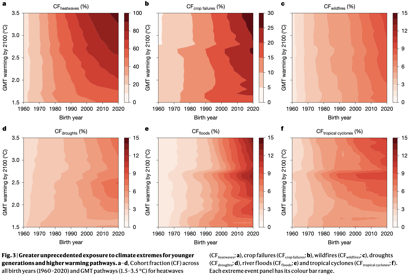 Abstract: Climate extremes are escalating under anthropogenic climate change1. Yet, how this translates into unprecedented cumulative extreme event exposure in a person’s lifetime remains unclear. Here we use climate models, impact models and demographic data to project the number of people experiencing cumulative lifetime exposure to climate extremes above the 99.99th percentile of exposure expected in a pre-industrial climate. We project that the birth cohort fraction facing this unprecedented lifetime exposure to heatwaves, crop failures, river floods, droughts, wildfires and tropical cyclones will at least double from 1960 to 2020 under current mitigation policies aligned with a global warming pathway reaching 2.7 °C above pre-industrial temperatures by 2100. Under a 1.5 °C pathway, 52% of people born in 2020 will experience unprecedented lifetime exposure to heatwaves. If global warming reaches 3.5 °C by 2100, this fraction rises to 92% for heatwaves, 29% for crop failures and 14% for river floods. The chance of facing unprecedented lifetime exposure to heatwaves is substantially larger among population groups characterized by high socioeconomic vulnerabilities. Our results call for deep and sustained greenhouse gas emissions reductions to lower the burden of climate change on current young generations.