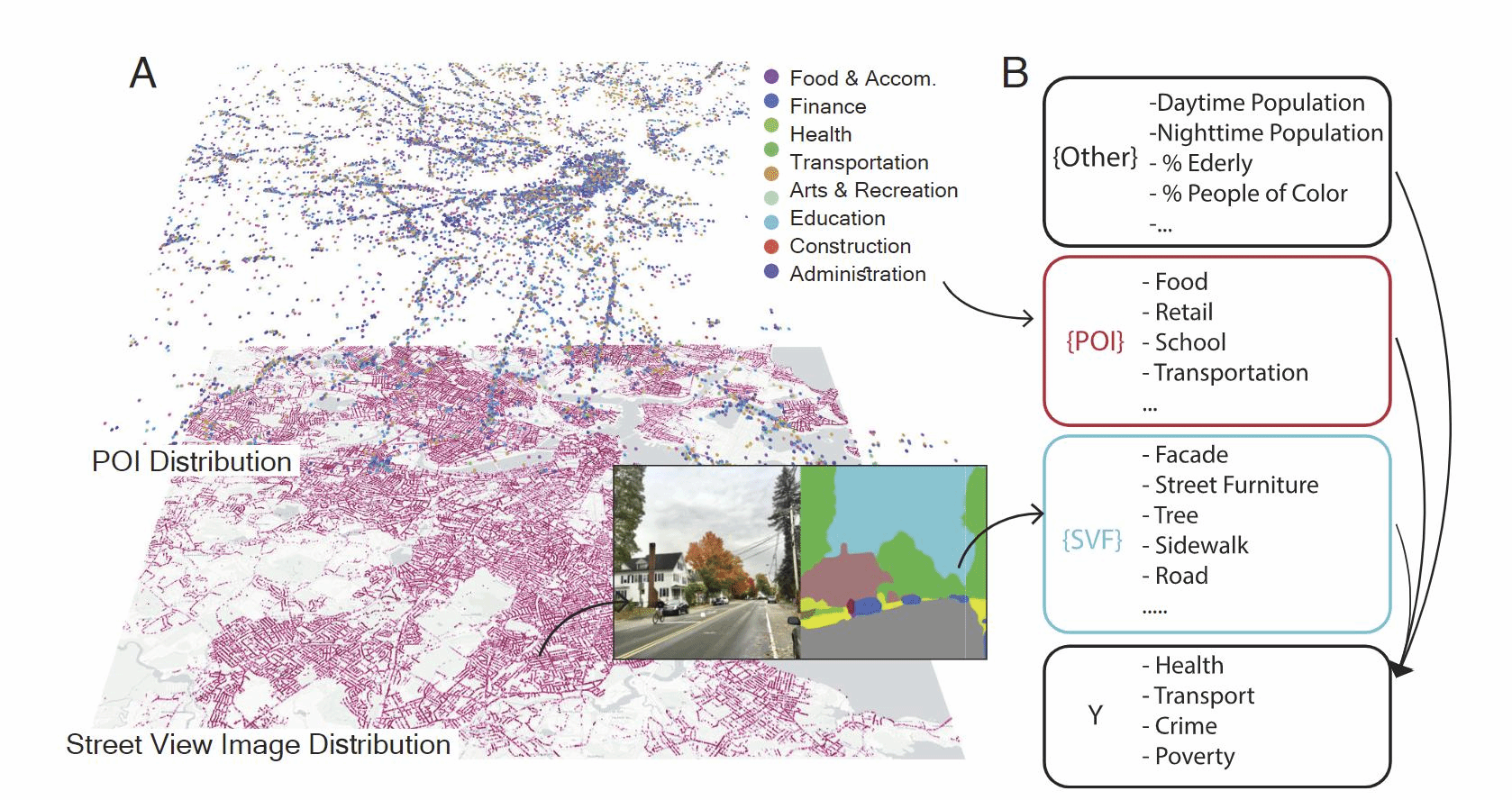 为了回答这些问题,我们收集了来自美国七个大都市区的80个县中的2700万张谷歌街景图像。通过运用深度学习的计算机视觉算法,我们从这些图像中提取出了如树木、人行道、汽车、建筑立面等城市特征,分析了这些特征在城市中的分布情况,以此来预测社区层面的贫困、健康、犯罪和交通状况。这些问题的选择主题既是基于先前研究中建筑环境与社会经济状态之间联系的证据,也与联合国的可持续发展目标相呼应。
