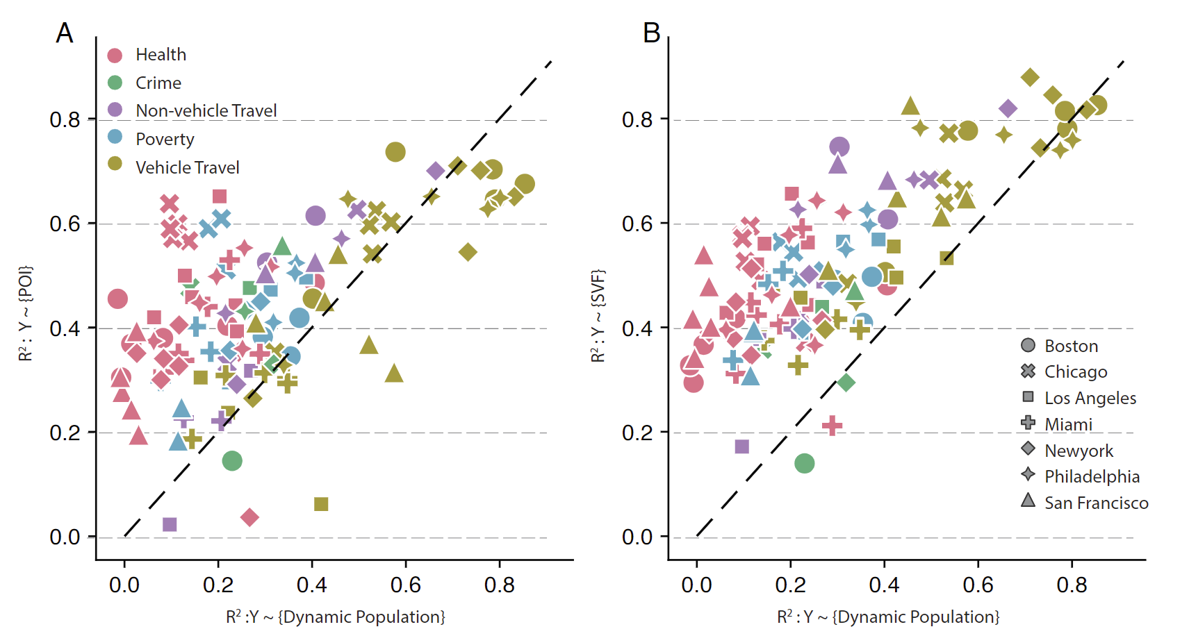 (A) 单独使用群体的模型和单独使用POI特征的模型之间的R2比较。平均而言,CT水平模型(Y~{POI})的R2比模型(Y ~{DynamicPopulation})的R2高约9.8%(t检验;P值<0.005)(SI附录,表S9)。(B) 单独使用总体的模型和单独使用SVF的模型之间的R2比较。平均而言,模型(Y~{SVF})的R2比模型(Y至{DynamicPopulation})(SI附录,表S7)的R2高约22.8%(t检验;P值<0.005)。我们注释45度线作为参考。线上方的任何点都表明,作为总体估计的函数,该模型优于该模型。