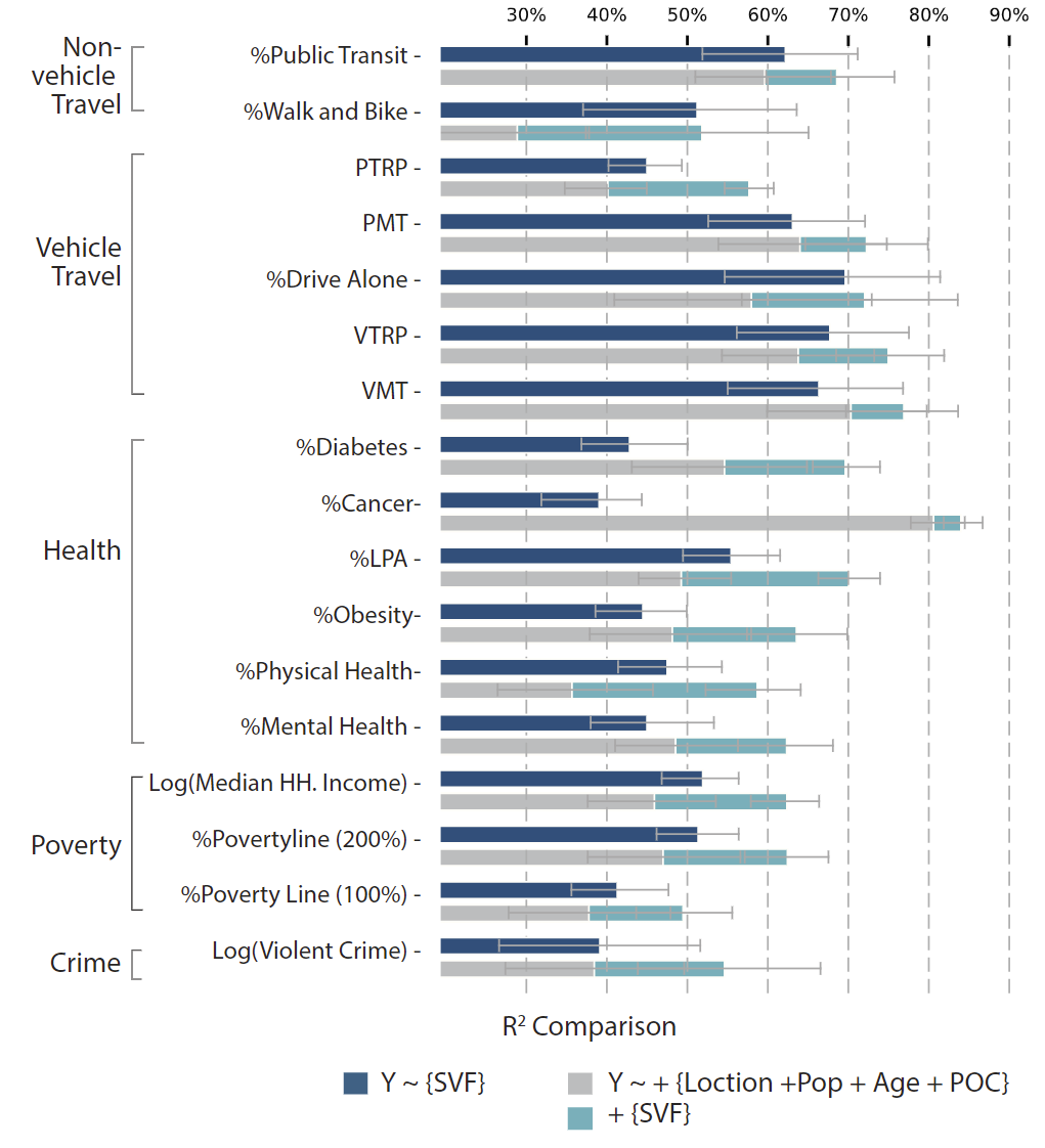 当模型仅考虑SVF时,深蓝色条表示R2。当模型只考虑位置、人口、年龄和有色人种时,灰色条表示R2。浅蓝色条表示通过将SVF添加到先前模型中获得的额外R2。给出了每个模型结果的误差条。平均而言,通过将SVF添加到模型中,我们能够将5%到25%添加到模型R2中。年龄代表65岁以上人口的百分比。POC代表非白人群体的人口比例。