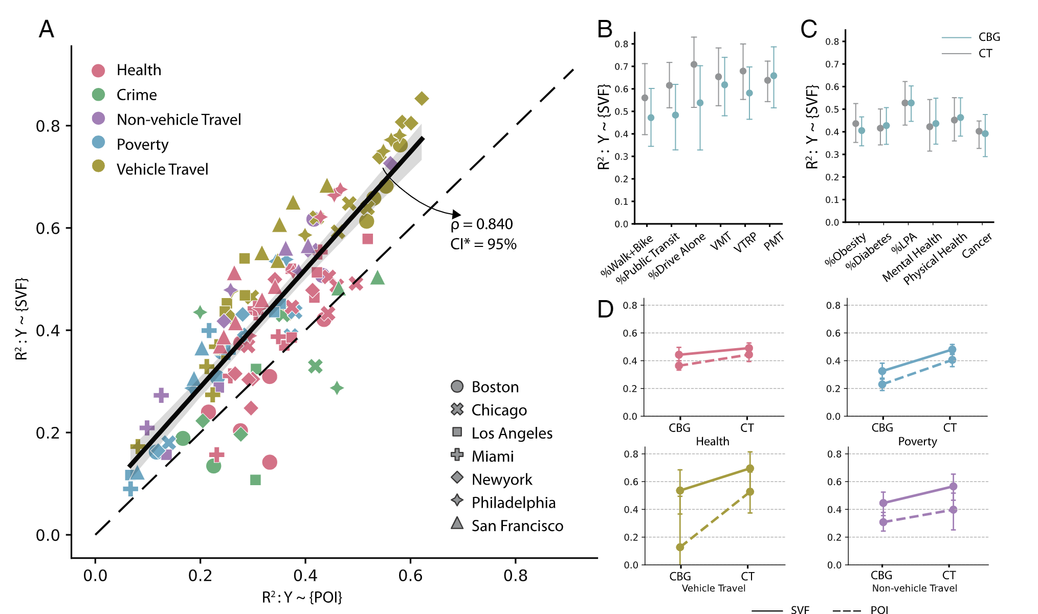 (A) 特征提取过程示意图:该研究收集了七个选定大都市地区街道网络沿线的GSV和POI数据。对于每个采样的GSV,我们使用图像分割模型(31,32)来提取图像的像素级标签,从而能够构建SVF(参见SI附录,图S1的放大示例。SI附录,表S3的SVF数据摘要)。(B) 利用POI、SVF和其他人口统计变量构建的特征,我们建立了模型来估计一系列社区社会经济变量(Y),并比较了模型结果,以评估SVF的估计能力。这些被选中的Y是根据城市生活的四个主要方面选择的:健康、交通、犯罪和贫困。