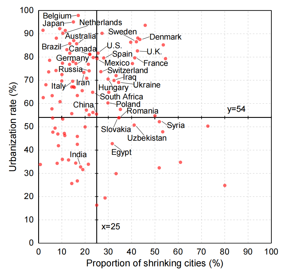 绘制了世界上102个国家2015年的城市化率和2013-2018年的收缩比例,这些国家拥有10个以上的自然城市和至少一个收缩城市。不同国家的城市化率是从联合国获得的。30个收缩城市数量最多的国家被贴上了标签。世界平均城市化率和收缩城市比例分别为54%和25%