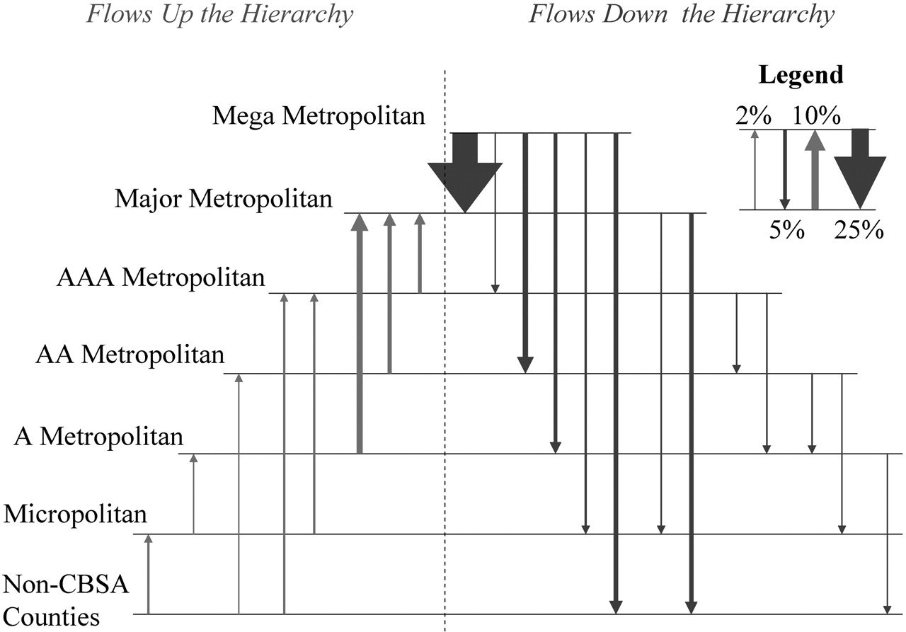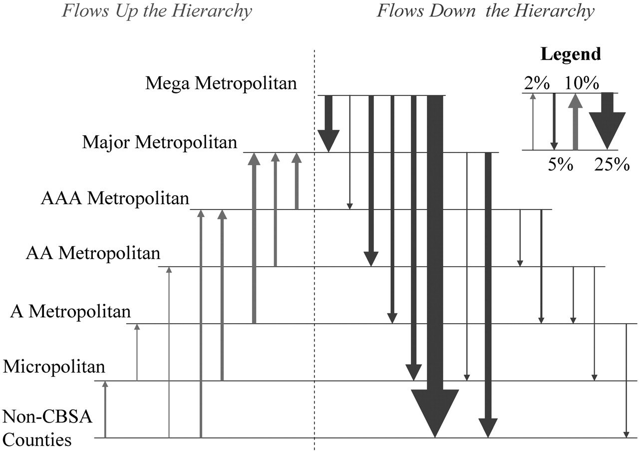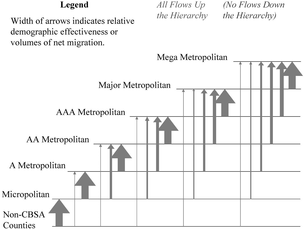 所有净迁移都沿着微城市/大都市的频谱向上,最大的净流量是层次结构相邻级别之间的阶梯迁移。