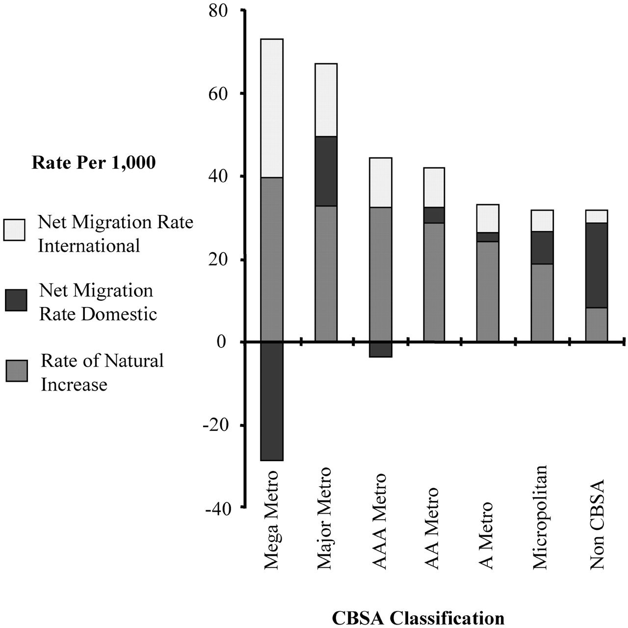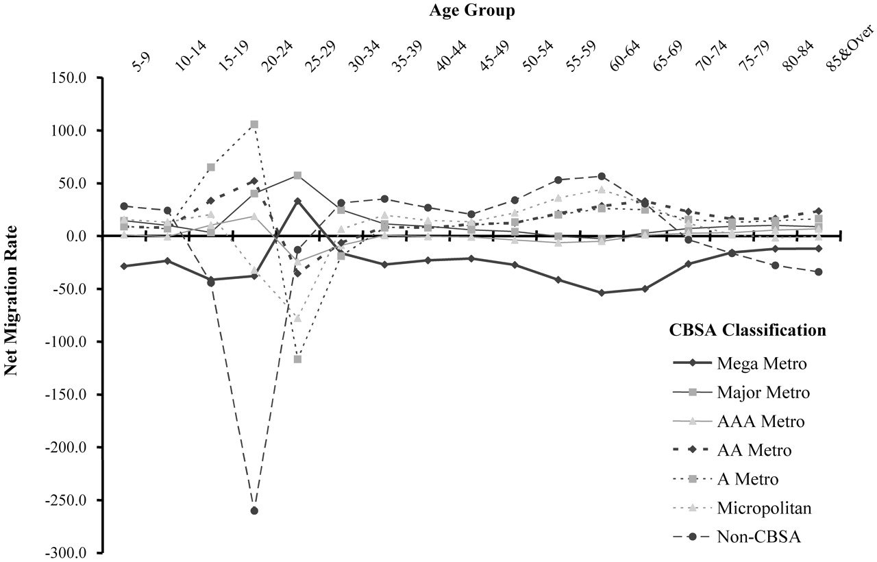 图 1995-2000年按CBSA等级划分的5岁年龄组的净移民率