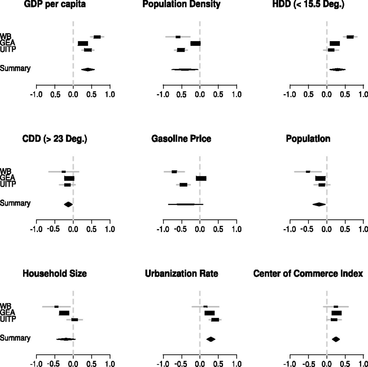 三个数据集中关键变量的能源使用以及荟萃分析的综合相关性;WB,温室气体排放;GEA,最终能耗;UITP,运输能耗。CI的中心方块与元分析中使用的权重成正比。总结措施相关CI由钻石给出;相关CI由横向钻石的尖端。灰色垂直虚线表示无效果。