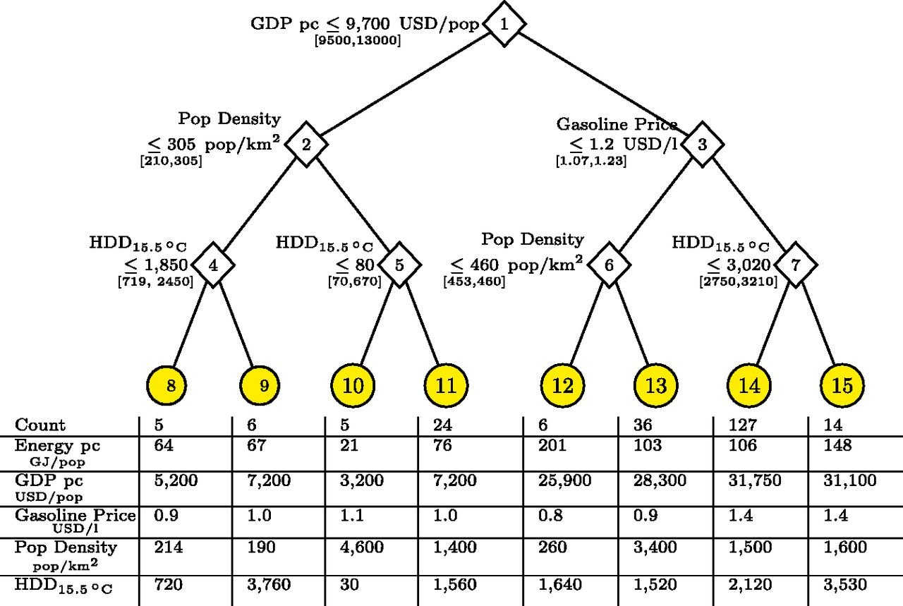 经济活动将城市划分为顶层(节点1)、人口密度和汽油价格第二级(节点2和3)以及第三级(节点4-7)的HDD和人口密度。因此,出现了八种类型的城市(节点8-15)