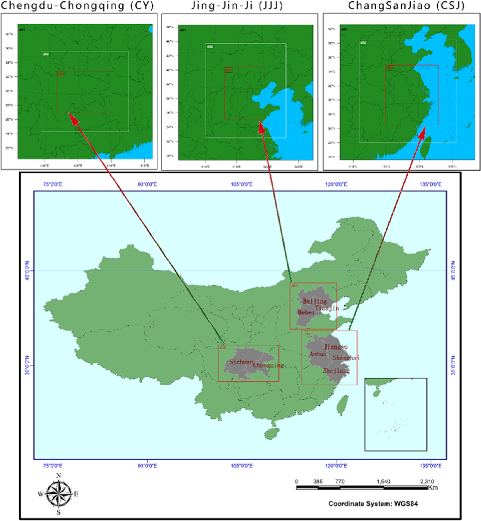 图 在中国的三个大都市地区的位置,以及在研究模拟中使用的每个大都市地区的三个领域