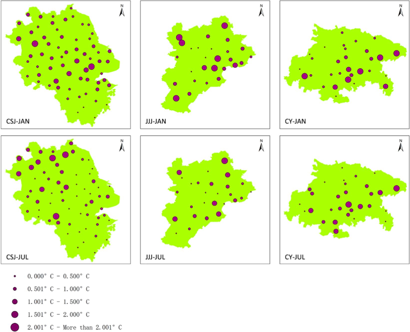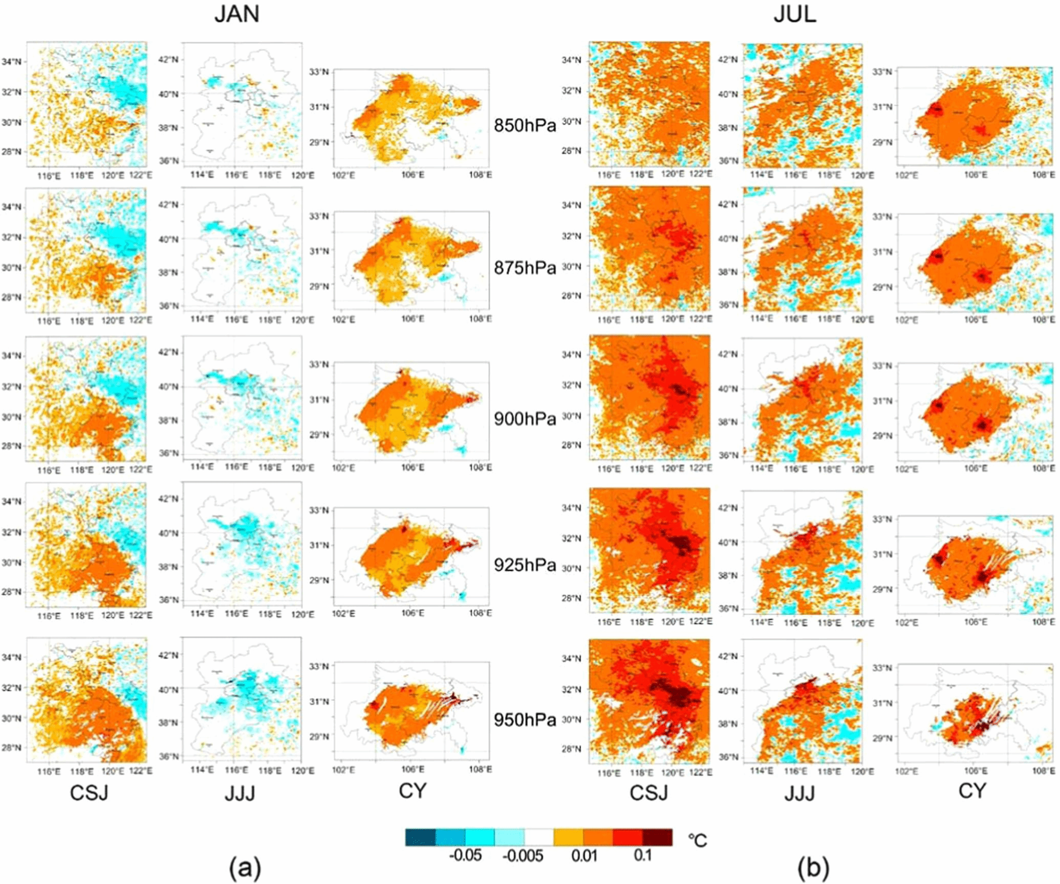 图 1月(a)和7月(b).三个城市群不同压力层中耕地城市化的潜在温度变化