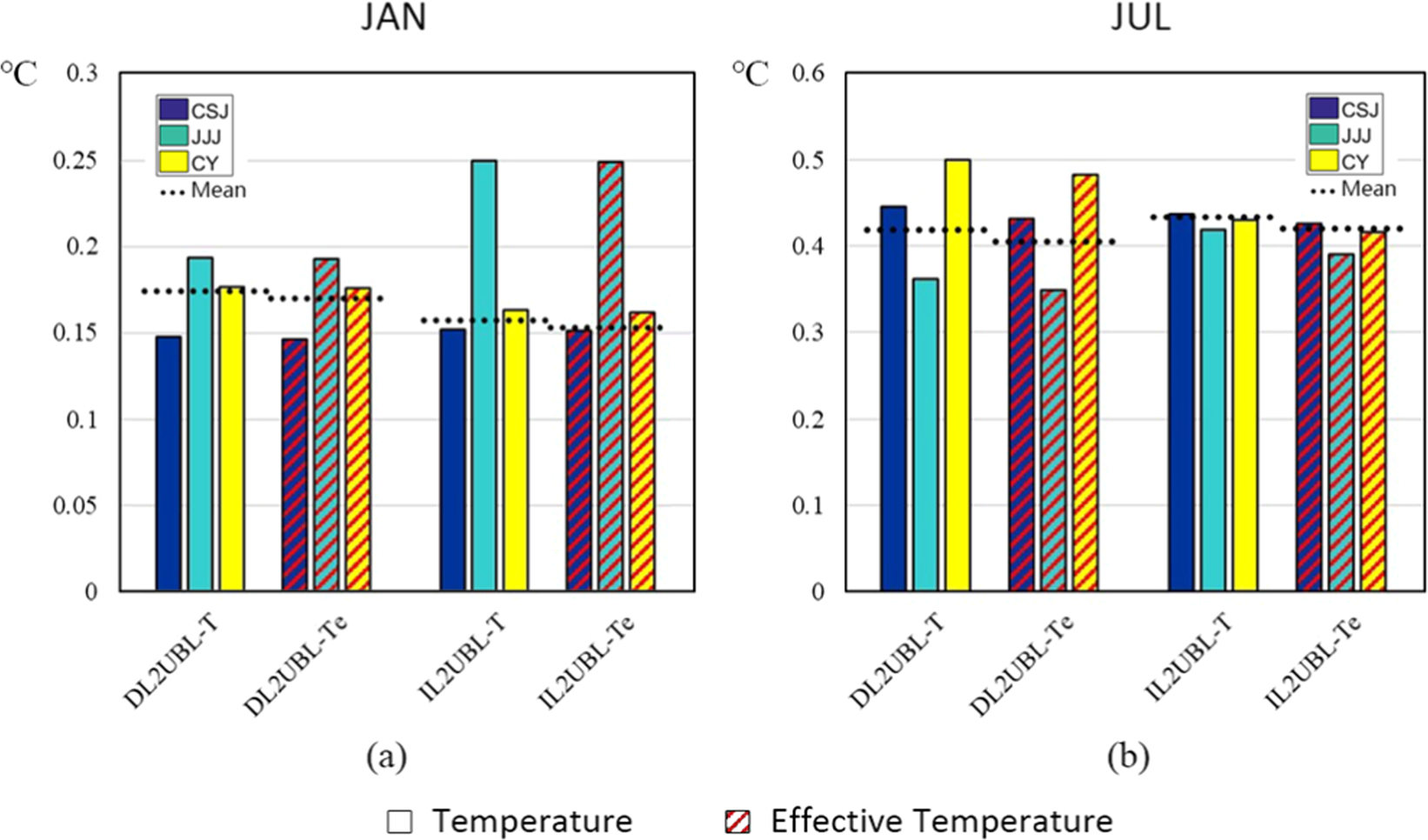 图 1月(a)和7月(b).,DL2UBL和IL2UBL城市化农田的Te 2-m温度和有效温度变化