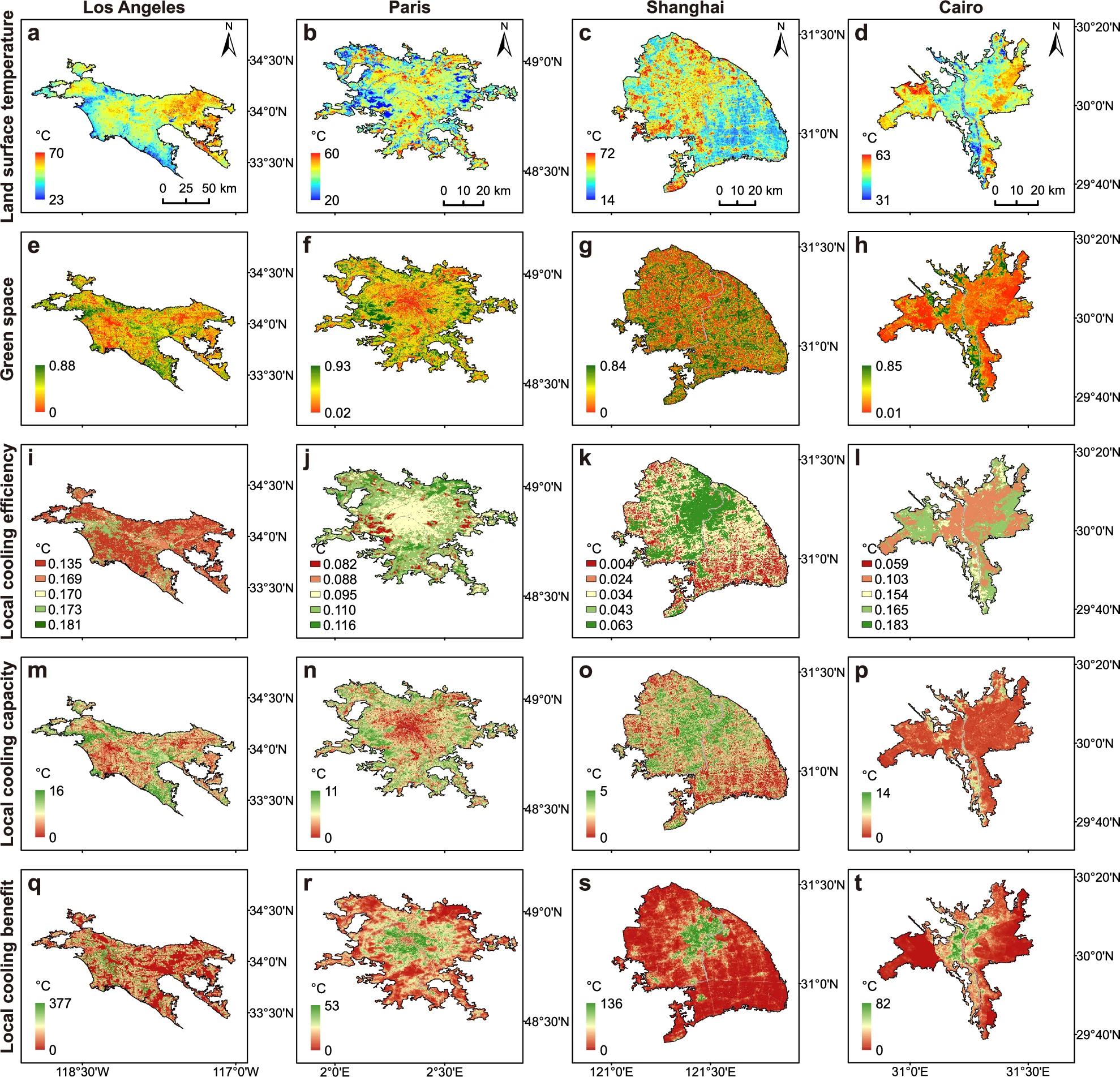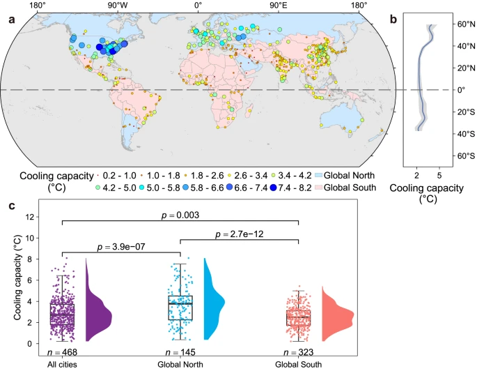 Abstract: Climate warming disproportionately impacts countries in the Global South by increasing extreme heat exposure. However, geographic disparities in adaptation capacity are unclear. Here, we assess global inequality in green spaces, which urban residents critically rely on to mitigate outdoor heat stress. We use remote sensing data to quantify daytime cooling by urban greenery in the warm seasons across the ~500 largest cities globally. We show a striking contrast, with Global South cities having ~70% of the cooling capacity of cities in the Global North (2.5 ± 1.0 °C vs. 3.6 ± 1.7 °C). A similar gap occurs for the cooling adaptation benefits received by an average resident in these cities (2.2 ± 0.9 °C vs. 3.4 ± 1.7 °C). This cooling adaptation inequality is due to discrepancies in green space quantity and quality between cities in the Global North and South, shaped by socioeconomic and natural factors. Our analyses further suggest a vast potential for enhancing cooling adaptation while reducing global inequality.