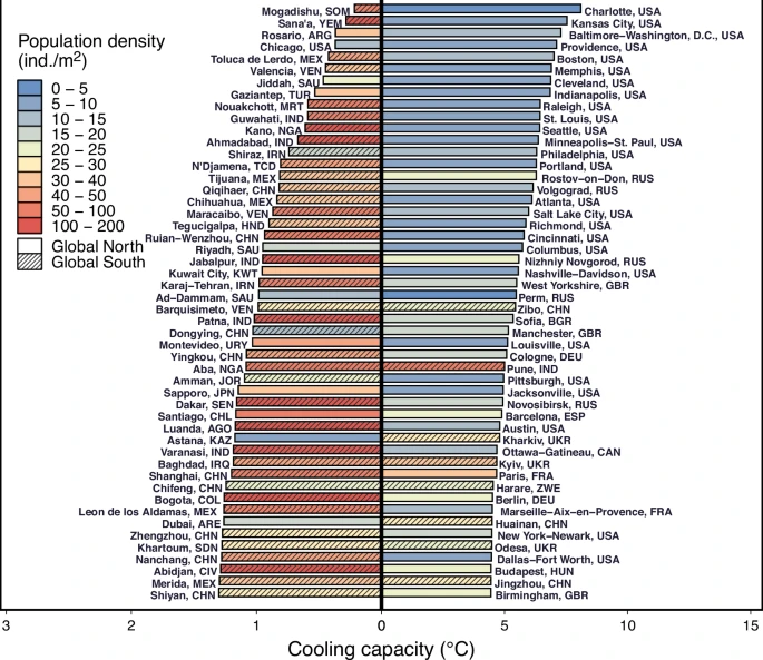 右侧的轴线比左侧的轴线大一个数量级,因此美国夏洛特的制冷能力比摩加迪沙(索马里)高出约37倍,比萨那(也门)高出29倍。制冷能力最低的城市与人口密度较高的全球南方城市最为相关。
