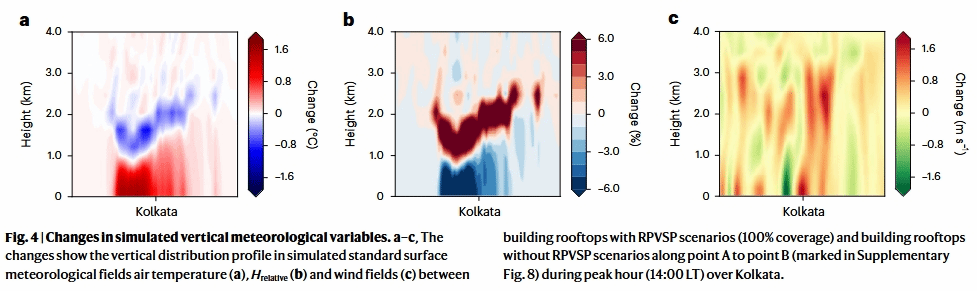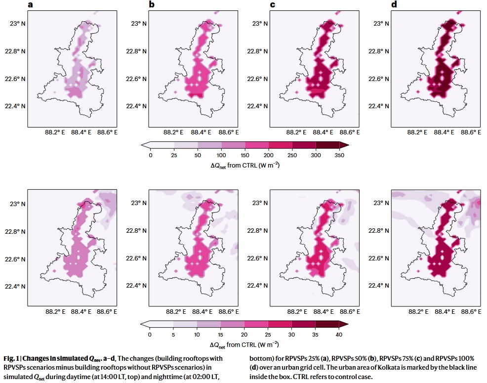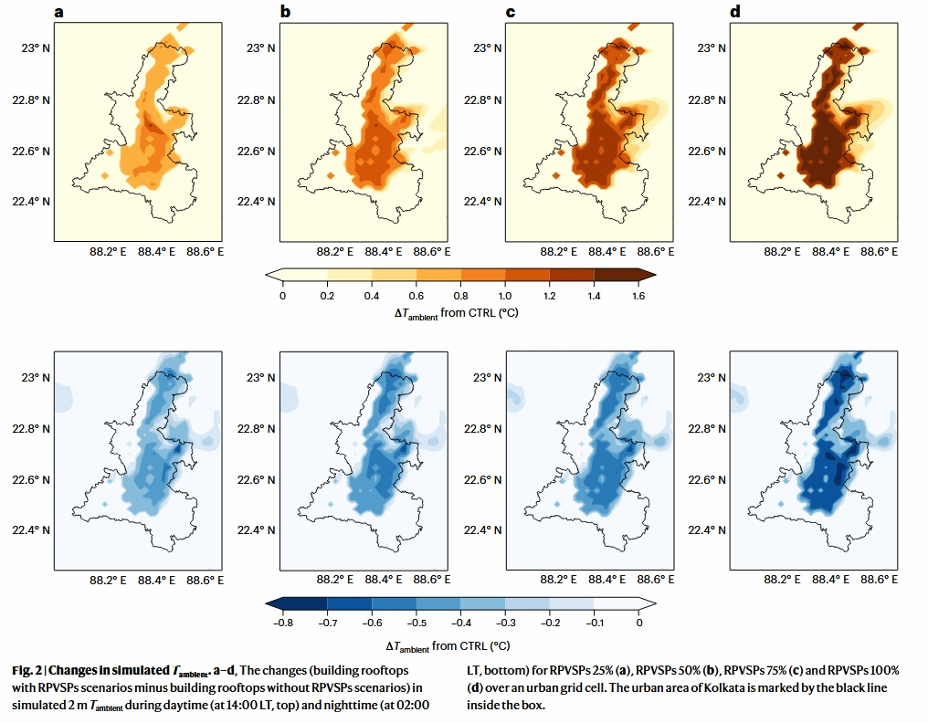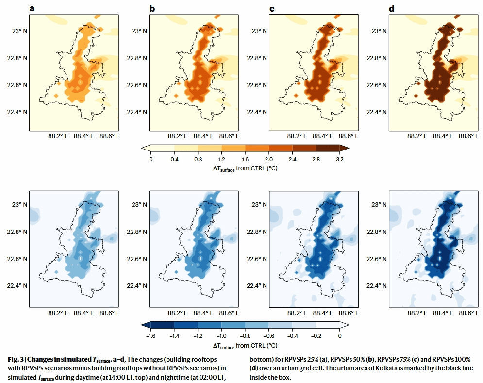 Abstract: The widespread adoption of rooftop photovoltaic solar panels in urban environments presents a promising renewable energy solution but may also have unintended consequences on urban temperatures. This is primarily due to their lower albedo, which leads to increased heat absorption and enhanced thermal convection between the panels and the underlying roof surfaces. Here we show that, in Kolkata, city-wide installation of these rooftop photovoltaic solar panels could raise daytime temperatures by up to 1.5 °C and potentially lower nighttime temperatures by up to 0.6 °C. Our study also reveals that rooftop photovoltaic solar panels significantly alter urban surface energy budgets, near-surface meteorological fields, urban boundary layer dynamics and sea breeze circulations. Comparative analysis with cities, such as Sydney, Austin, Athens and Brussels, supports these findings, providing valuable insights for policymakers on managing large-scale solar panel installations. Understanding these effects is crucial for balancing the benefits of renewable energy with its potential impacts on urban climates.